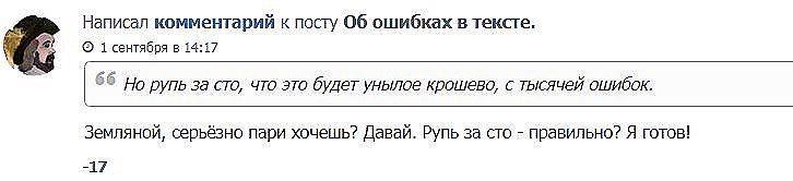 Кстати, автор того поста ещё вполне тихий. Вот недавно местный писатель Земляной тоже запостил на эту же тему, мол, какое там правописание, а все редакторы мудаки. Потом предложил пари "рупь за сто" - пусть редактор сам напишет что-нибудь: