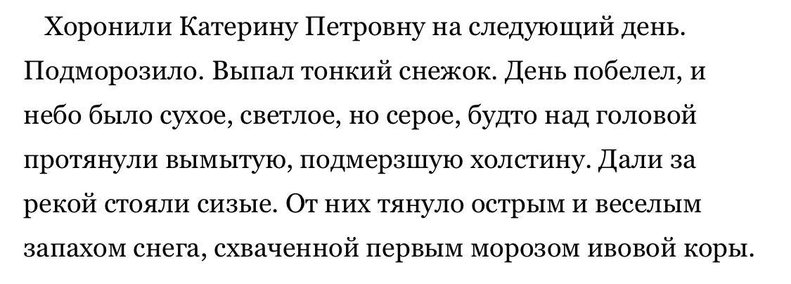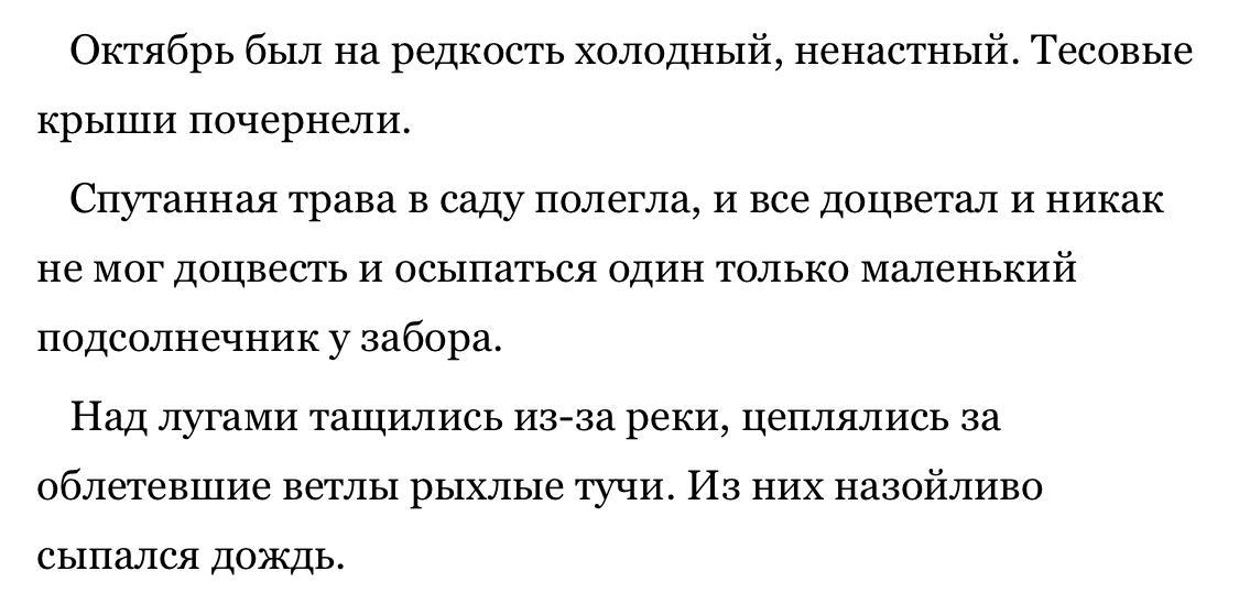 Осенний день как и старая женщина побелел, иссох и укрылся подмёрзшей холостимой. Только для Катерины Петровны это стало посмертным покрывалом.