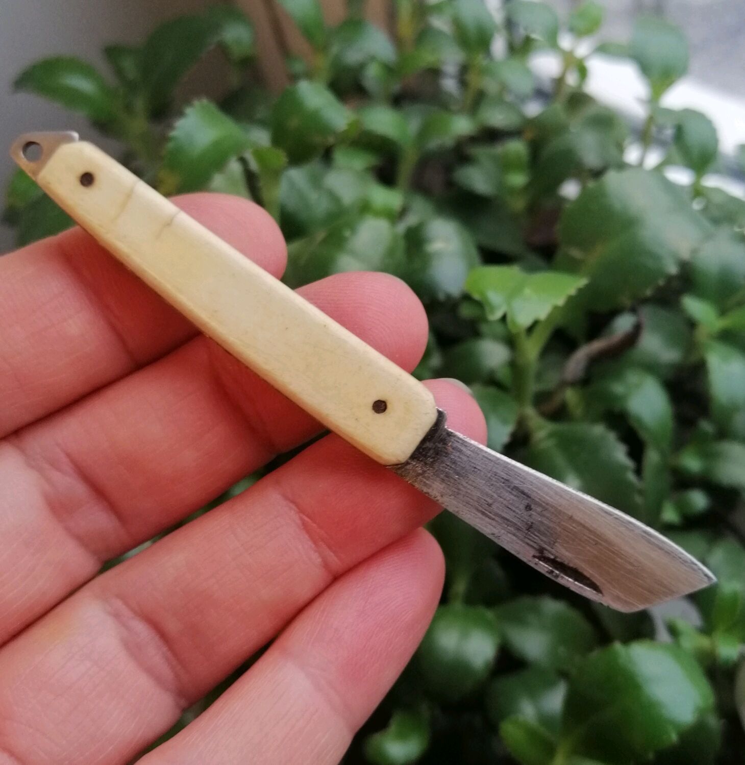 Однажды, шарясь по мастерской деда, я обнаружил девайс, который можно было бы счесть опасной бритвой, кабы не форма клинка. Более всего ножичек напоминал уменьшенную примерно втрое складную копию танто. Которую почему-то заправили под опасную бритву, кабы даже не острее. Сразу отмечу: фото не моё, и не того самого девайса - просто нашёл в Сети наиболее близкий по форме. Но именно близкий, а не идентичный!