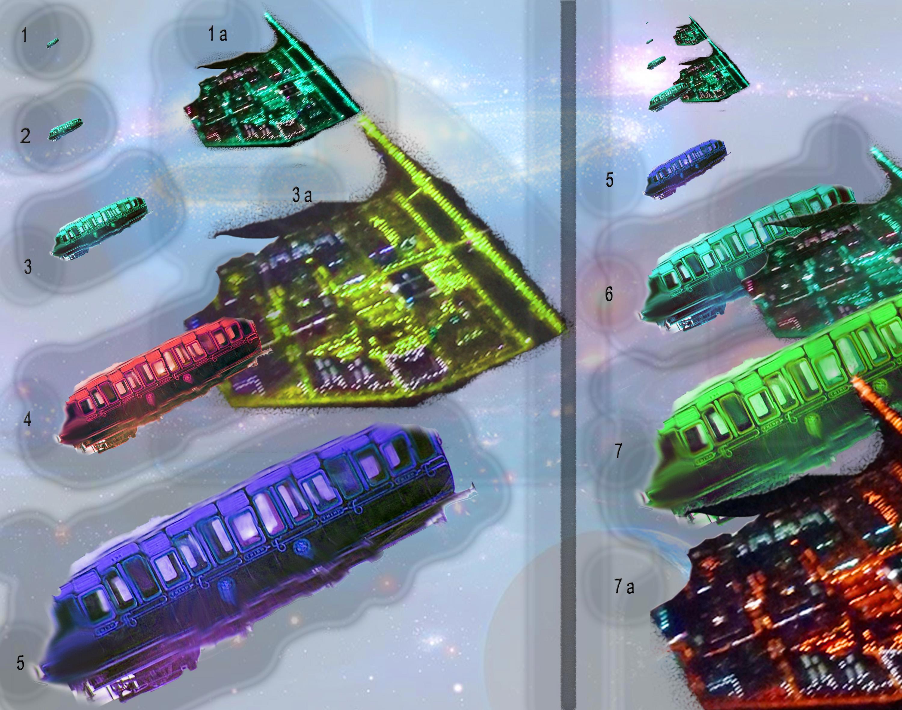 7 – орбитальный грузовоз, большой транспортник-ковчег, малый летающий космодром, флагман, 2-5 км (без возможности полной посадки), 10 - 100 тыс. человек (1 млн человек. с пассажирами у транспортников)