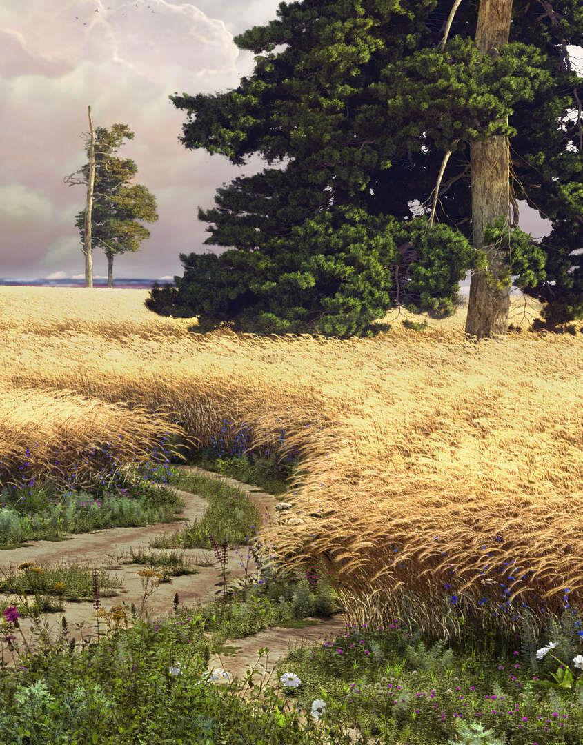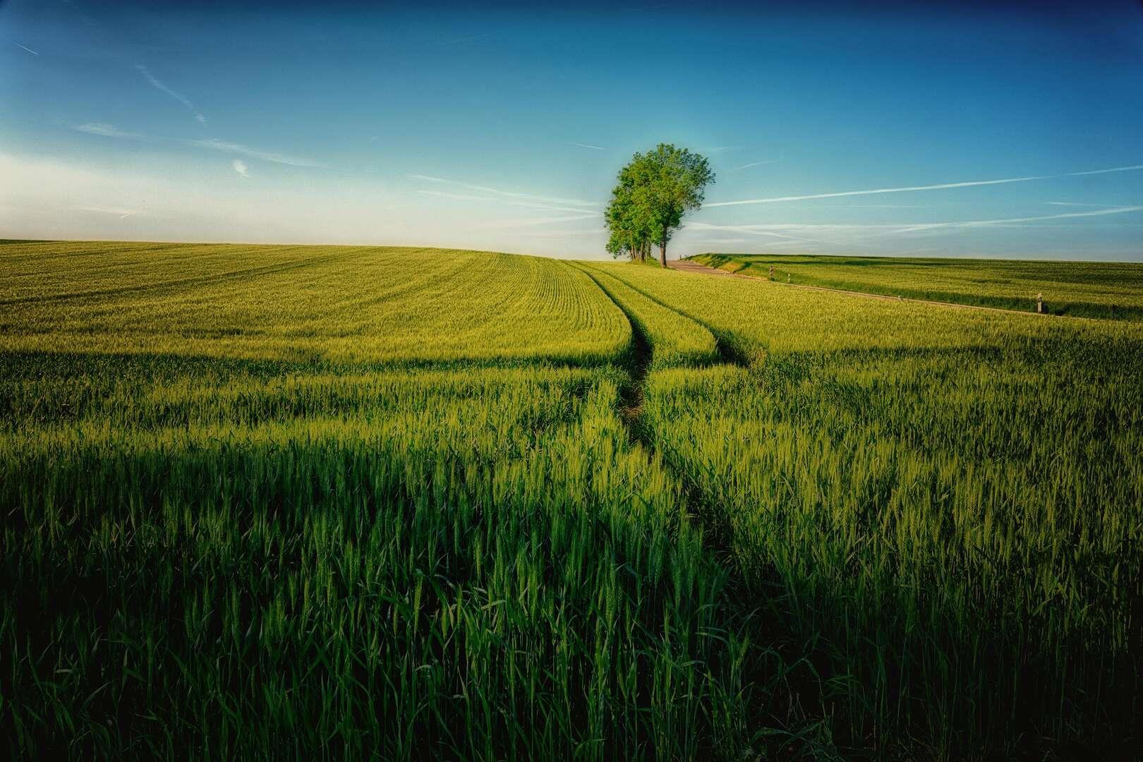 Красивая дорога между зелеными травянистыми растениями, склонами, полевыми деревьями
