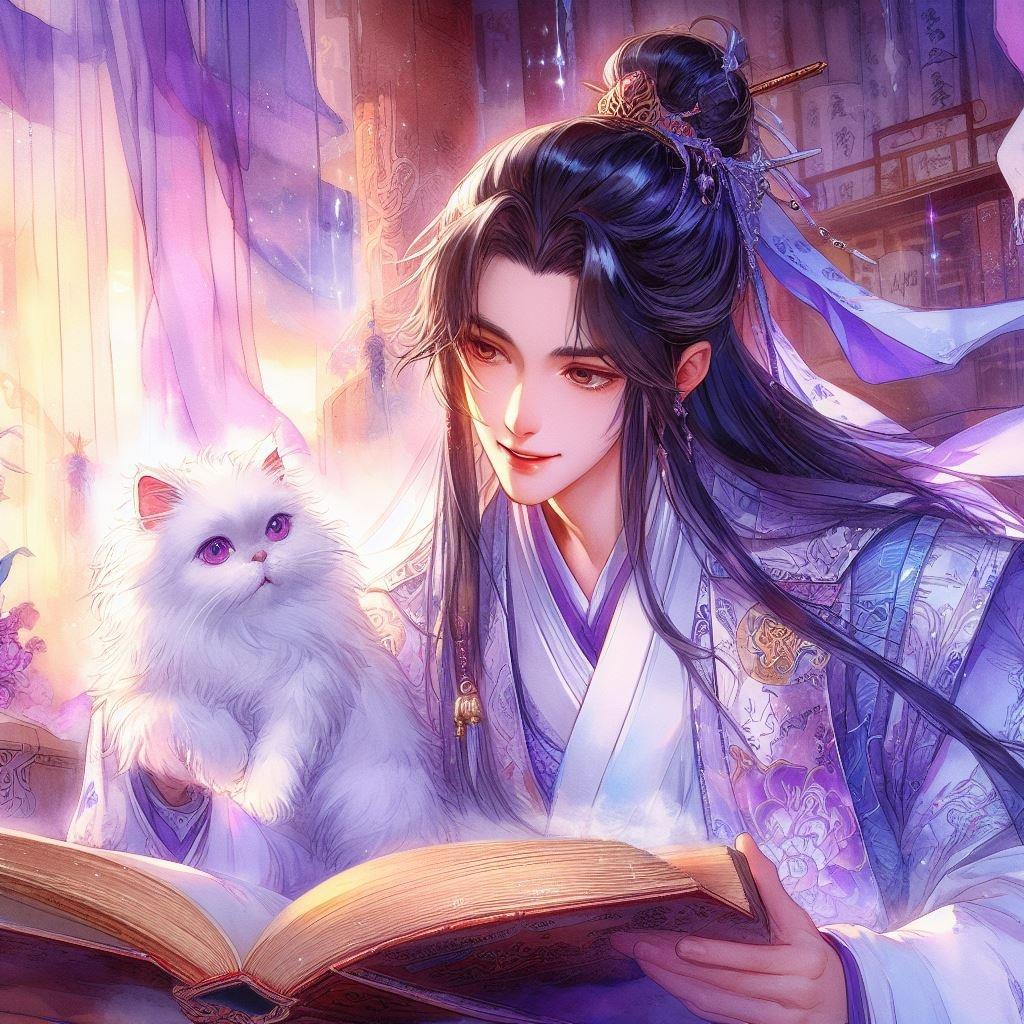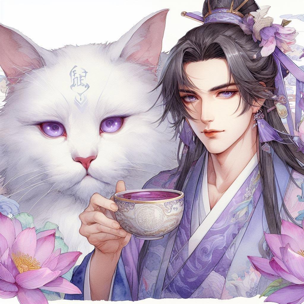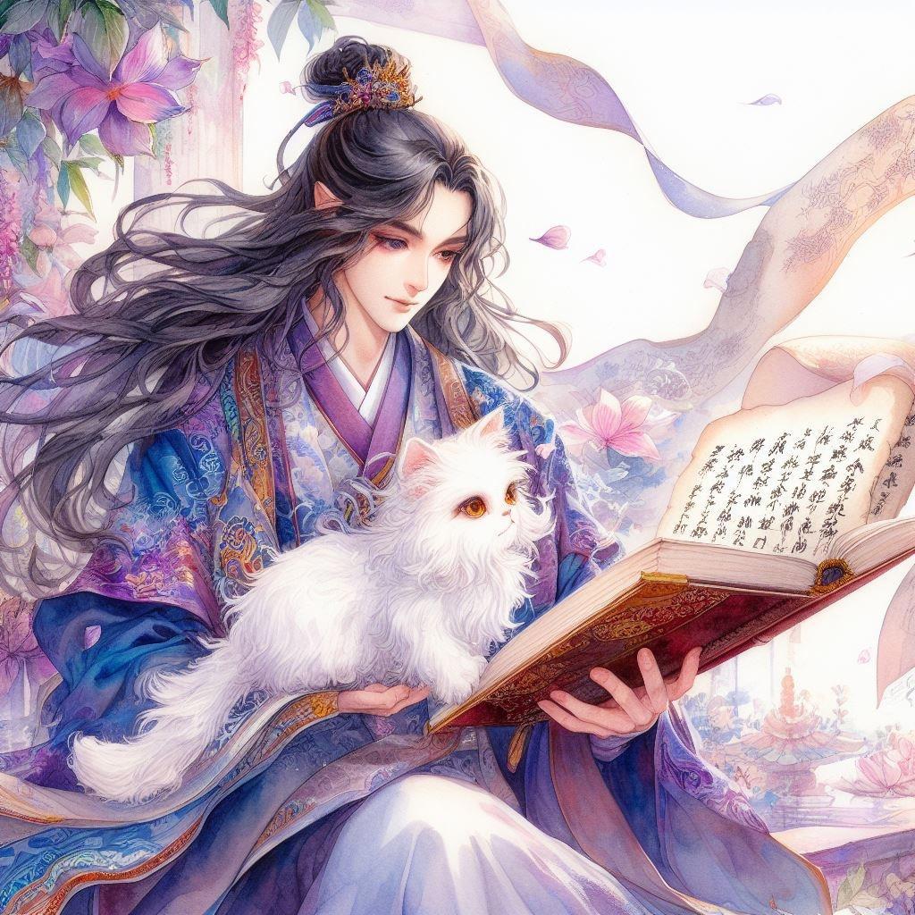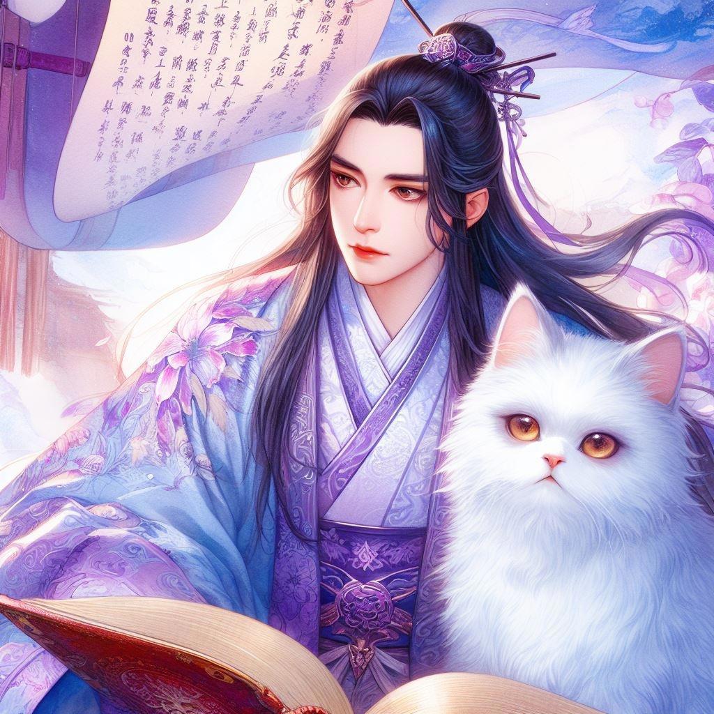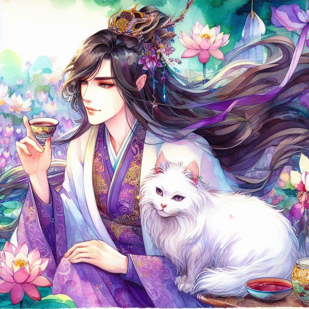 На этот раз Лань Веньхуа из книги "Безмятежный лотос" со своим ручным бездонным демоном, который маскируется под кота :)