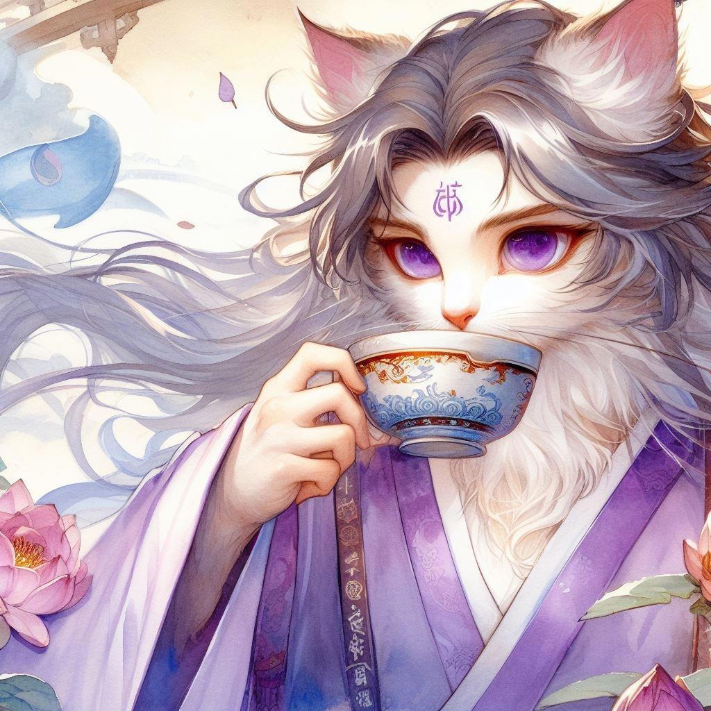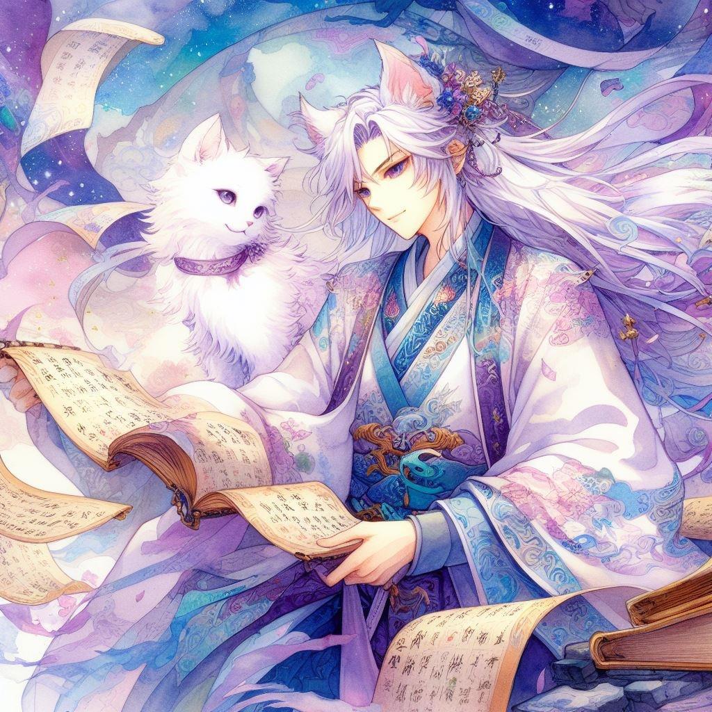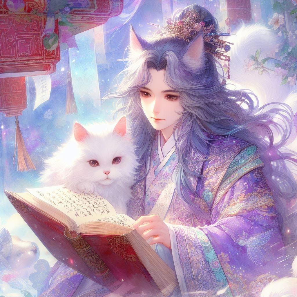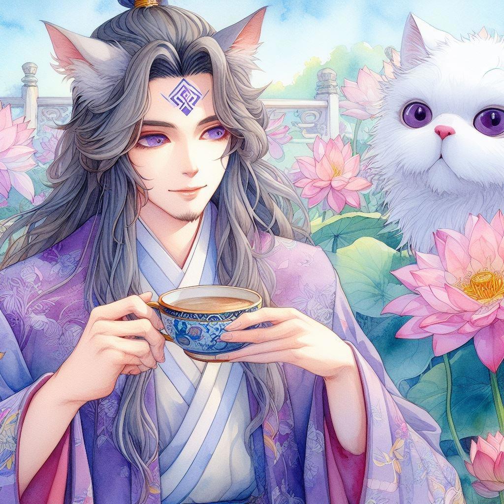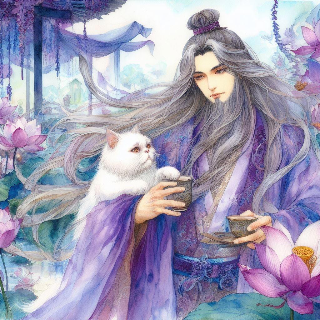 На этот раз Лань Веньхуа из книги "Безмятежный лотос" со своим ручным бездонным демоном, который маскируется под кота :)