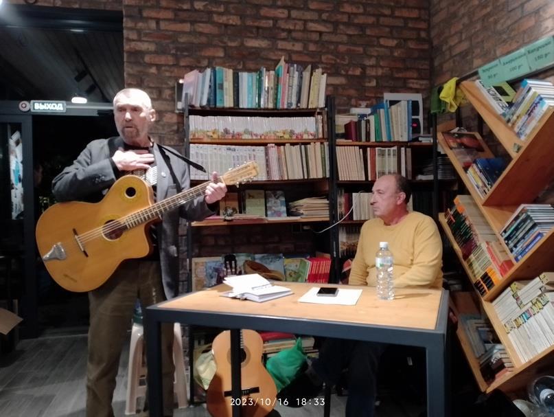 Так вот!!! Вчера в восемнадцать часов по московскому времени в парке Волгограда, а точнее — в очаровательном стеклянно-кирпичном строеньице «Народная библиотека» состоялся творческий вечер Михаила Смотрова, в котором принял участие и я, свидетельством чему да послужит следующая фотография работы Игоря Шахина.