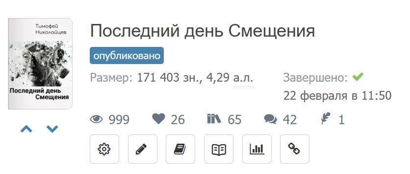 Автор: Тимофей НиколайцевУважаемые коллеги! Сегодня в ночь уезжаю в Москву, а оттуда в Нижний Новгород на семинар Захара Прилепина. И вот о чем жалею перед отъездом - повесть "Последний день Смещения", публикованная в тревожную (лично для меня) дату 22 февраля тут, на Атвор.Тудей - так и висит с 999-ю просмотрами. Не знаю, как вы справляетесь с подобным, а вот я меня это расстраивает так же сильно, как Шелдона Купера расстраивала невозможность закончить фразу. :0)) Снова и снова всю последнюю неделю я проверяю страницу книги, но цифра 999 - висит, как приклеенная :0(((