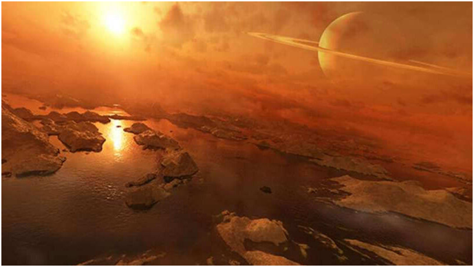 Титан – крупнейший спутник Сатурна, второй по величине спутник в Солнечной системе (после спутника Юпитера Ганимеда), является единственным, кроме Земли, телом в Солнечной системе, для которого доказано стабильное существование жидкости на поверхности, и единственным спутником планеты, обладающим плотной атмосферой (в 1,5 раза плотнее земной); она состоит из азота (98 %) с примесью метана. Это единственное место Солнечной системы (помимо Земли), где есть жидкие озера. Это озера этана и метана (жидкий природный газ), которые постоянно пополняются метановыми дождями. Несмотря на странный химический состав озер и низкую температуру на Титане (минус 179 по Цельсию), это мир, где постоянно происходят химические процессы.