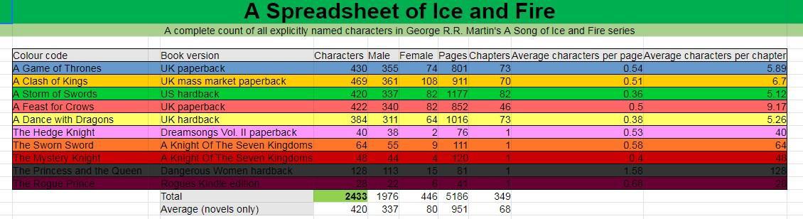 Джордж Мартин, упоротый графоман, давно забивший на свой самый лютый проект, поставил всех раком поначалу. Всего то взял за основу реальную историю средних веков, поменял имена и названия, добавил фэнтези-сеттинг и выдал тот самый неформат, который выстрелил точно в цель. Гляньте статистику, сколько персонажей в каждой книге: