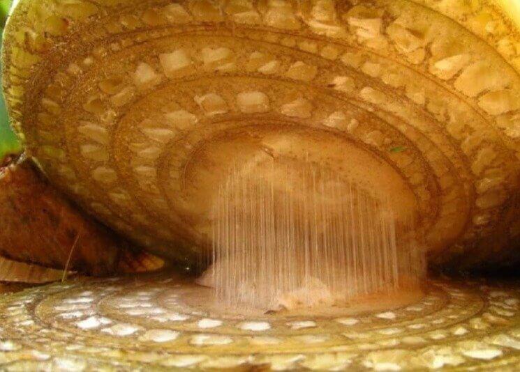 Этот взгляд изнутри на разрезаемое банановое дерево довольно драматичен. На первый взгляд это похоже на какую-то чужую планету или что-то такое, что вы могли бы увидеть в тропических джунглях. Итак, что же мы на самом деле видим? Ну, для начала, эти крошечные штучки, похожие на струны, посередине - это всего лишь крошечные ниточки, которые удерживают все вместе. Вы можете видеть, как их раздвигают, как разделяют две половинки бананового дерева.