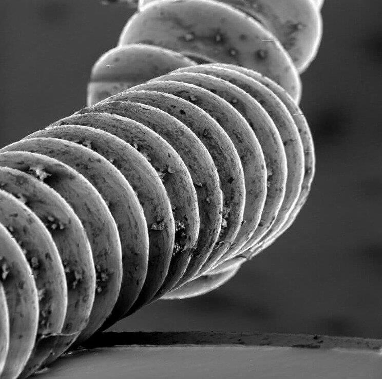 Гитарные струны не выглядят такими уж завораживающими, когда мы видим их на гитаре. Однако они выглядят довольно странно, если смотреть на них под микроскопом. Эта гитарная струна похожа на какого-то гигантского червя, который просто извивается. Конечно, это всего лишь металлическая струна, изготовленная человеком, и есть довольно веская причина для тех ребер, которые вы видите на струне. Без них гитарные струны не вибрировали бы так сильно, как сейчас.