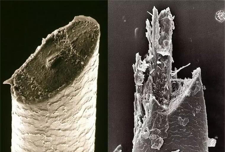 На самом деле это две отдельные фотографии, сравниваемые бок о бок. На фотографии слева изображен волосяной фолликул на лице после срезания традиционной бритвой. На фотографии справа изображен волосяной фолликул после того, как он был срезан электробритвой. Разница здесь довольно разительная. На фотографии слева видна очень аккуратная стрижка, в то время как на фотографии справа видна прядь волос, которая выглядит так, как будто ее растрепали.