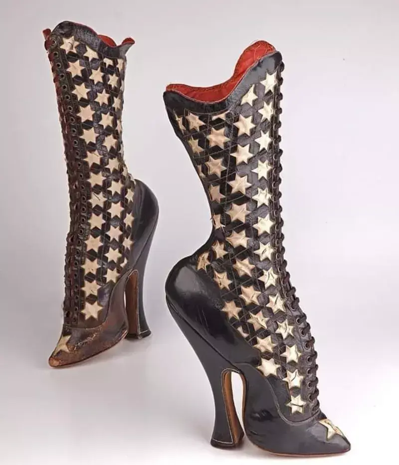 Артистки-женщины каждый вечер зашнуровывались и надевали эти стильные кожаные ботинки во время своих выступлений. На них много звезд и каблук, который заставил бы съежиться даже моделей с подиума. Ботинки сохранились почти в идеальном состоянии и демонстрируют странные виды моды, которые были приемлемы в те времена.