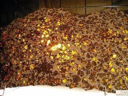 Этот красивый камень теперь известен как метеорит Фуканг. Он покрыт кусочками кристаллов оливина и заключен в железоникелевую матрицу.
