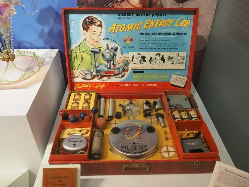 Родители целыми днями беспокоились о возможной войне, в то время как их дети изучали технологии. Одной из самых причудливых и уникальных детских игрушек того времени была "Лаборатория атомной энергии" Гилберта по ядерной физике, которая содержала три куска живого урана и счетчик Гейгера.
