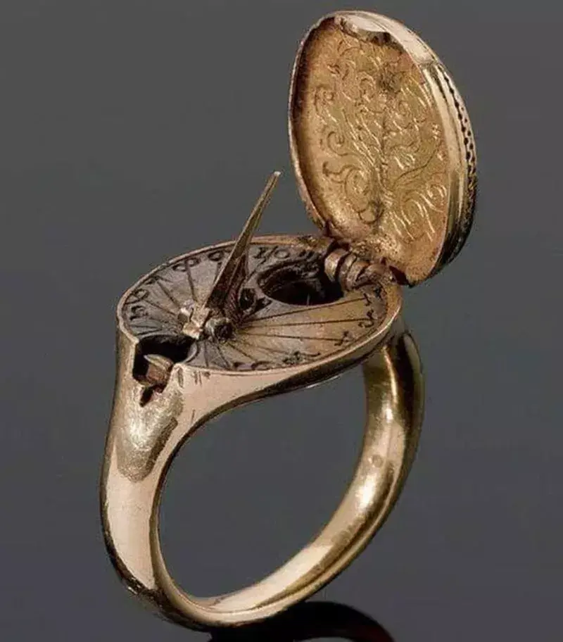 Это золотое кольцо 16 века с солнечными часами и компасом