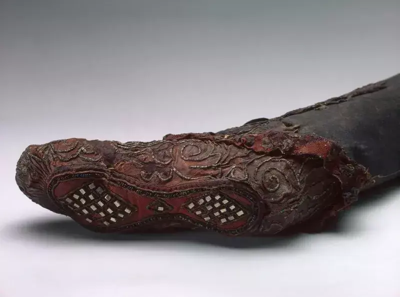 Ботинок на картинке датируется 300 годом до нашей эры и использовался путешественниками в горах Алтая. Он сохранился благодаря леденящему холоду, который сохранил его в идеальном состоянии для восхищения исследователей. Ботинок содержит различные материалы, такие как оловянная посуда, кристаллы пирита, золотая фольга и стеклянные бусины. Хотя это не похоже ни на что из того, что мы когда-либо носили, вы не можете не оценить его прекрасное мастерство.