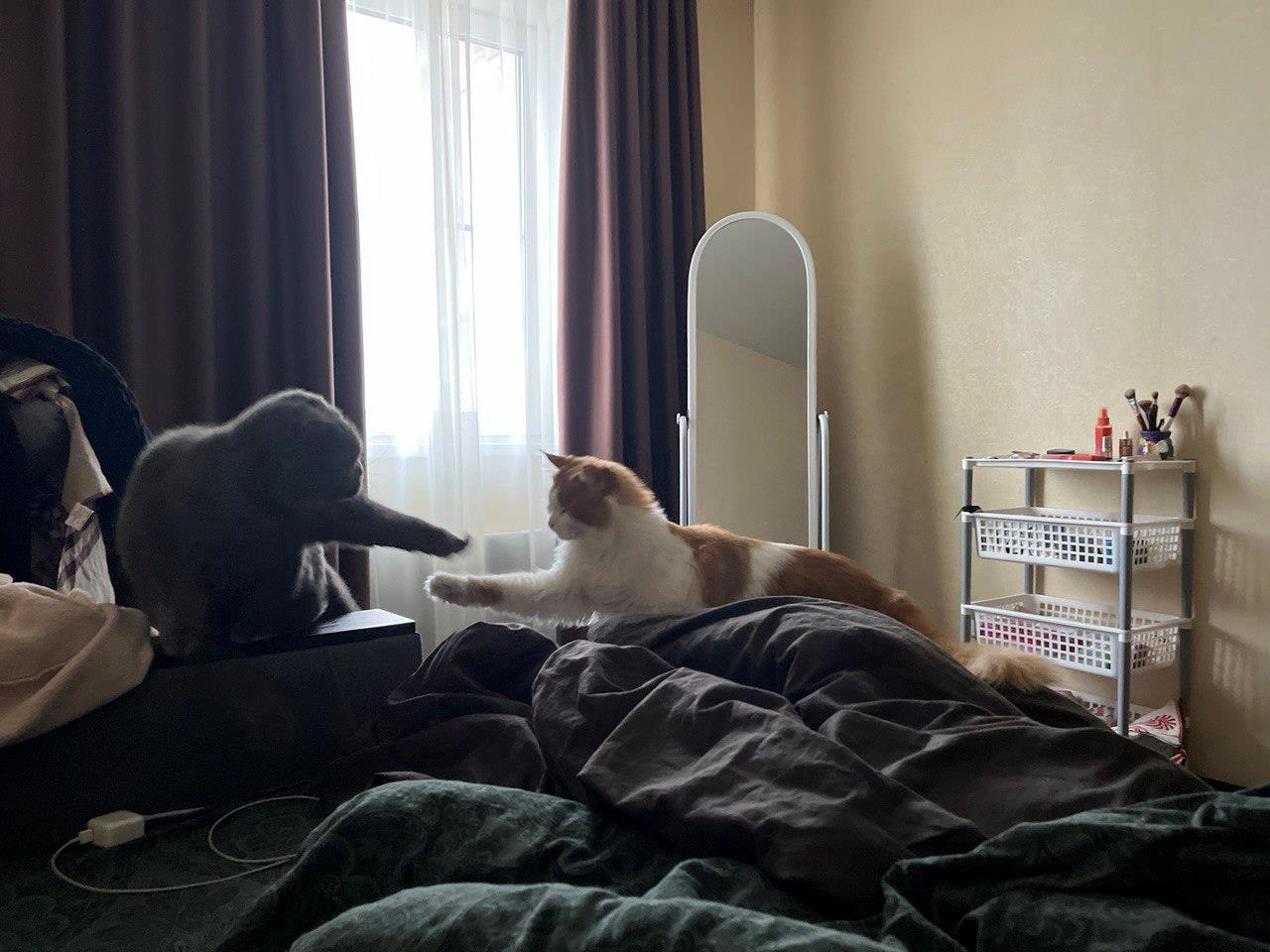 Если не знать подноготную и не вдумываться в происходящее, можно подумать, что коты дают друг другу "пять" на снимке.