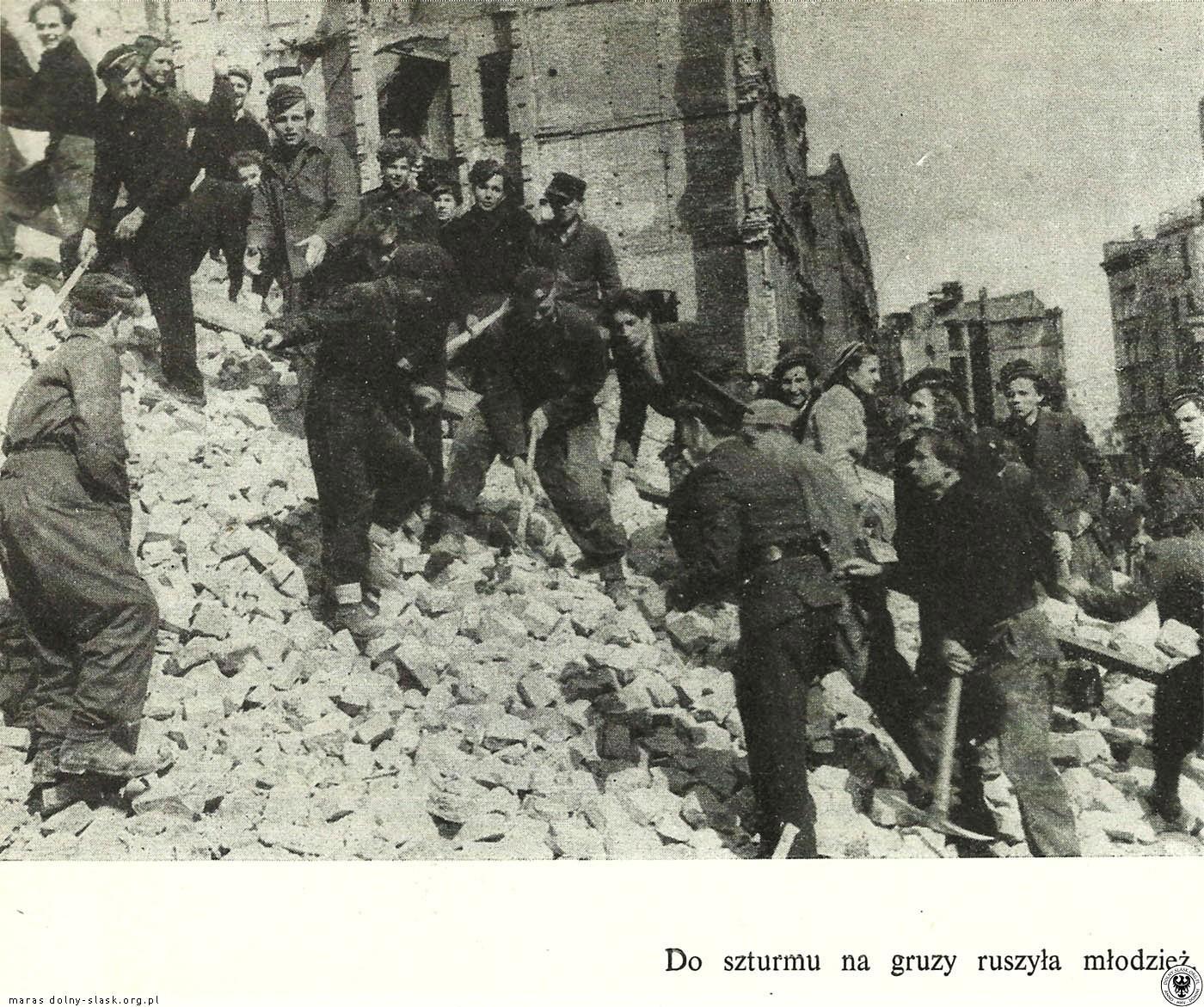 Поляки на разборке развалин. Обращает внимание большое количество молодых и здоровых мужчин.