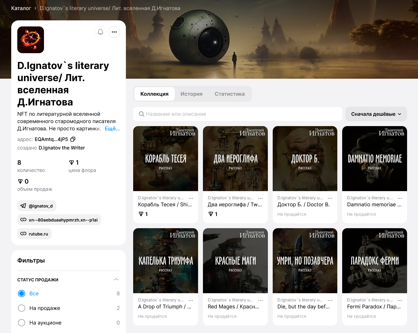 Коллекция выложена на сайте GetGems.io и постепенно пополняется. Доступны как NFT в 1 TON, так и слоты «не на продаже», по которым можно сделать своё предложение - хоть по 0,05 TON.