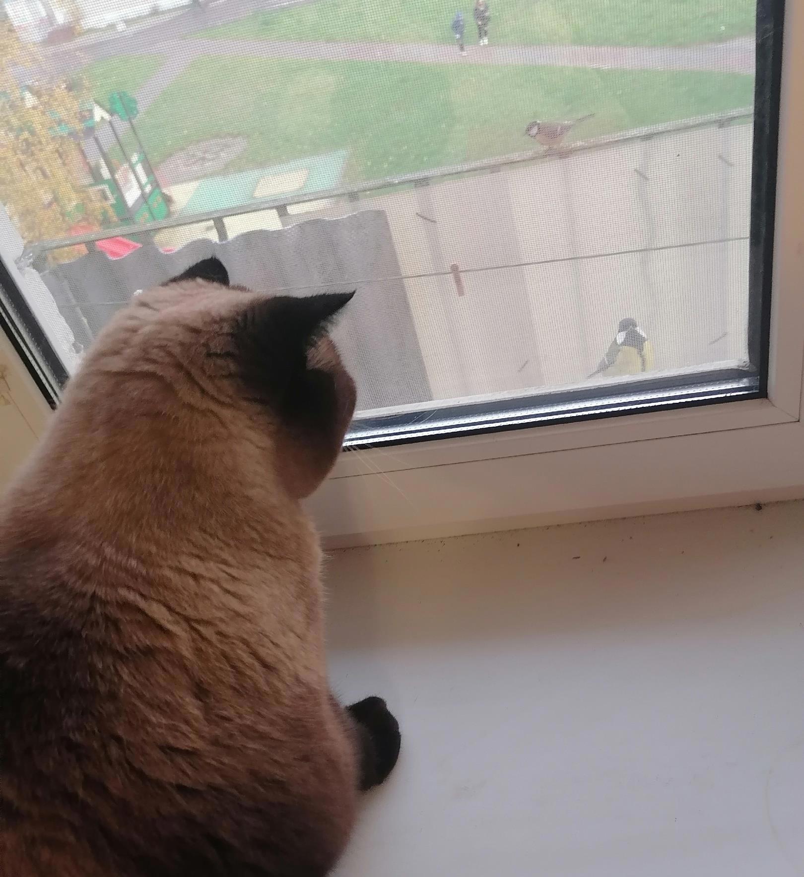 Во-первых - хорошо знакомый вам наш котик. На сей раз его терроризируют синички: слетаются к окну чуть не стаями. Причем если он не обращает внимания - долбятся в стекло: