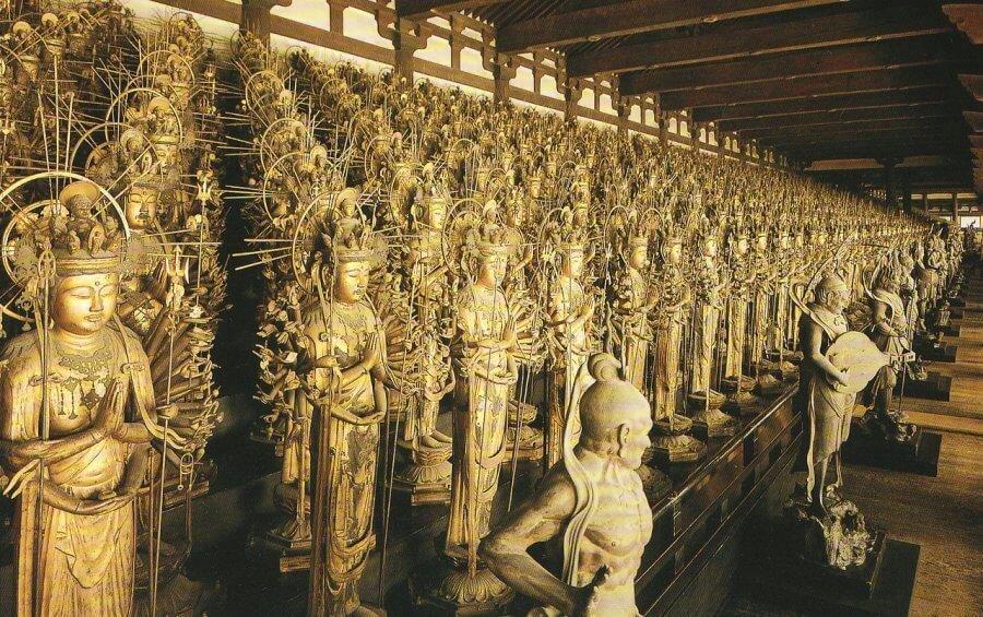3. Сандзюсангэн-до ( 三十三間堂 ). О, ну это прямо скрытая жемчужина Киото. Настолько скрытая, что я совершенно случайно забрел в него 2 раза с перерывом в 6 лет, раскошелившись аж на 600 иен )) Ошибиться несложно - с виду храм довольно невзрачный, хоть здание и датируется 13 веком. Правда, считается самым длинным деревянным зданием Японии, но снаружи - ничего особенного, смотрите сами. Зато внутри - настоящая японская версия Терракотовой армии. Стройными рядами стоит 1001 статуя богини в человеческий рост, а там еще и демонов куча... Фотографировать внутри нельзя, так что фото "армии" спер в интернете.