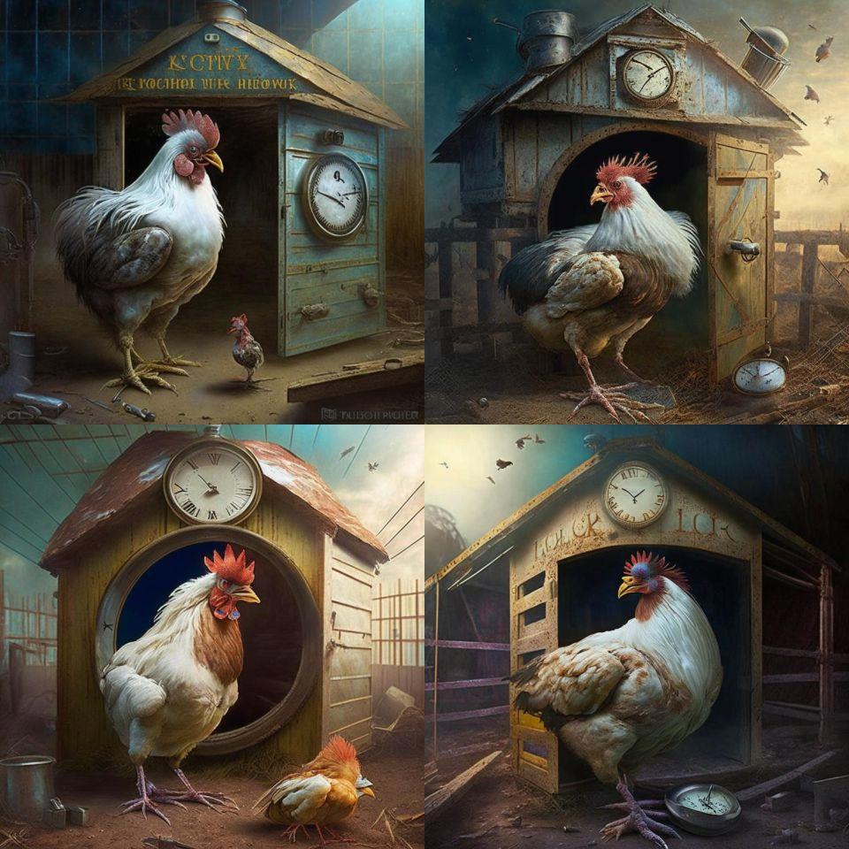 9. По законам курятника. Честно говоря, результат ожидаемый: куры, курятник, часы в качестве символа времени из тэга "попаданцы во времени". Ну, и доминирующий самэц, как воплощение закона на одном из вариантов картинки. :)))