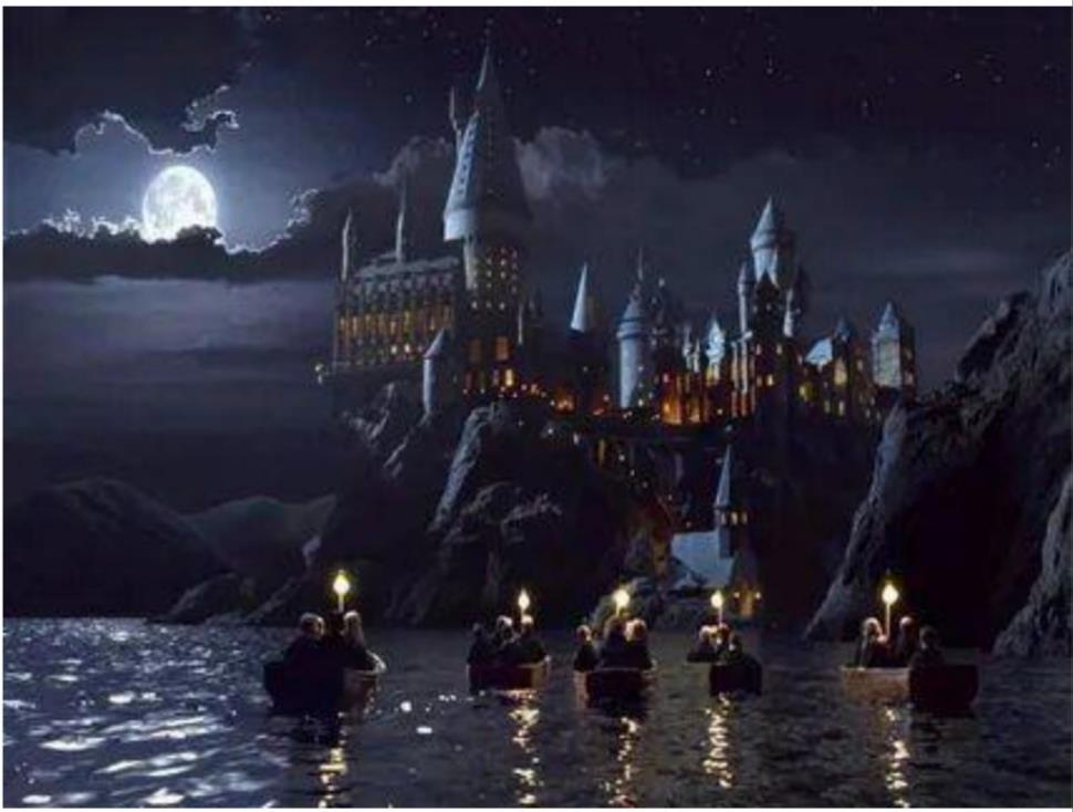 Узкая тропинка неожиданно вывела всех на берег, огромного, чёрного озера более освещенного чем платформа. На другой стороне, на вершине высокой горы, сверкая ажурными окнами среди звёздного неба, стоял громадный с многочисленными башнями замок, Академия Магии и Волшебства Хогвартс во всей своей красе.