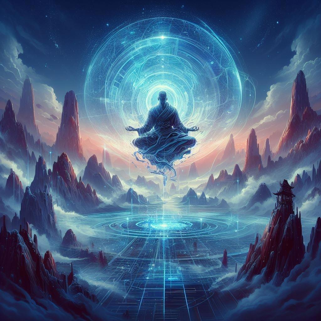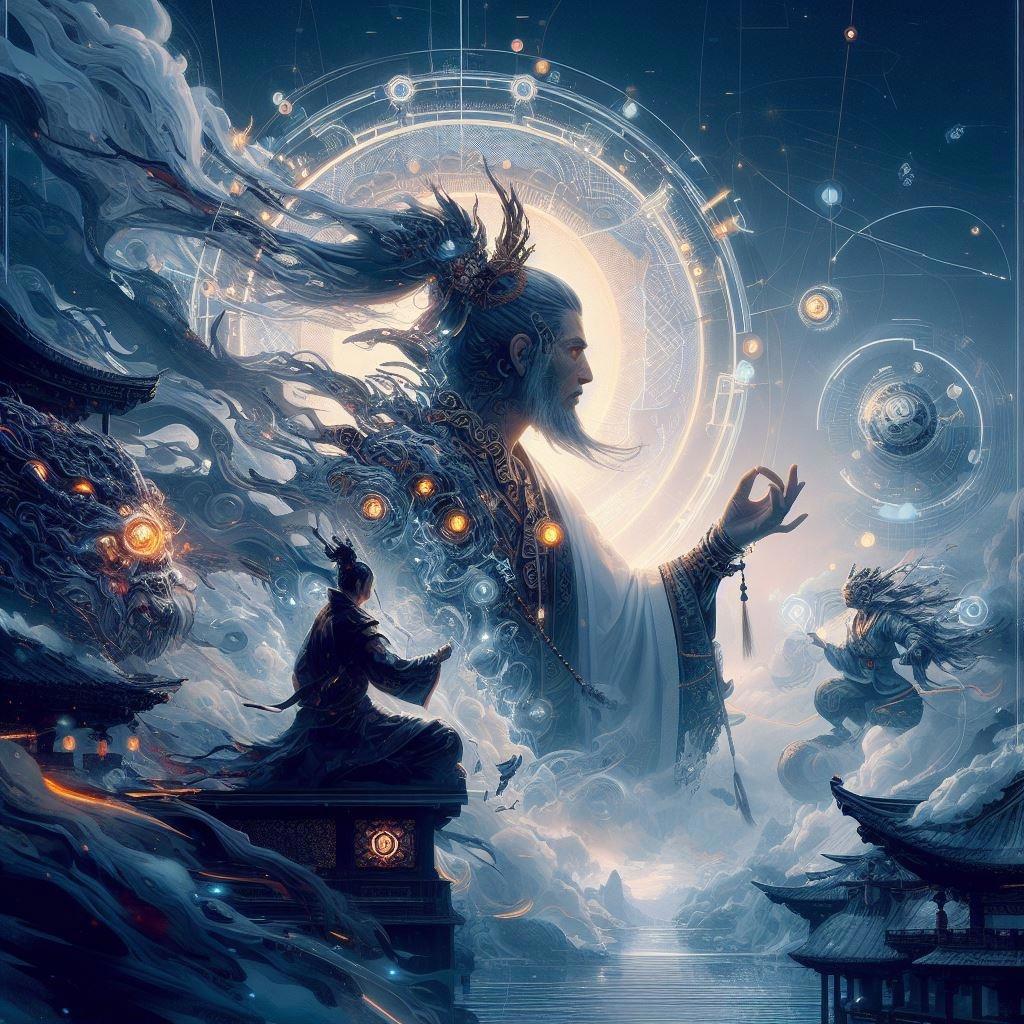 А вот на книге "Игровой разум" нейросеть прямо оттянулась))) Такие глубокомысленные философские картинки про разум и богов рисовала, что даже неловко было ее прерывать и просить парня в ханьфу: