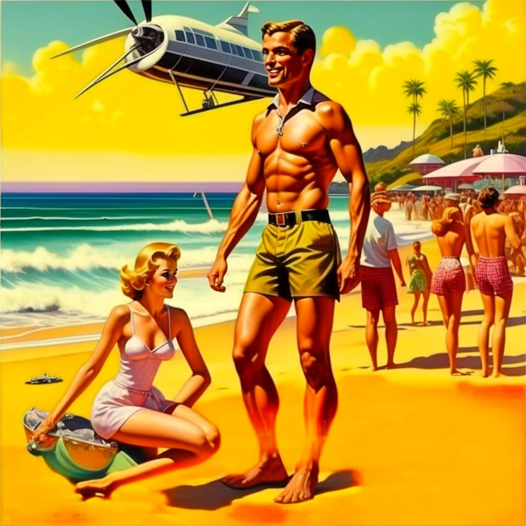 По аннотации выдало нечто креативное. Так и не поняла, почему у парня голый торс с воротником и шорты хаки с армейской пряжкой на пляже) А на чем сидит барышня - и вовсе за гранью осмысления) Но зато вертолет есть. Почти дирижабль.