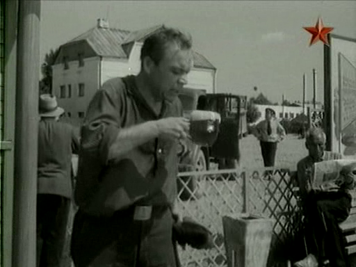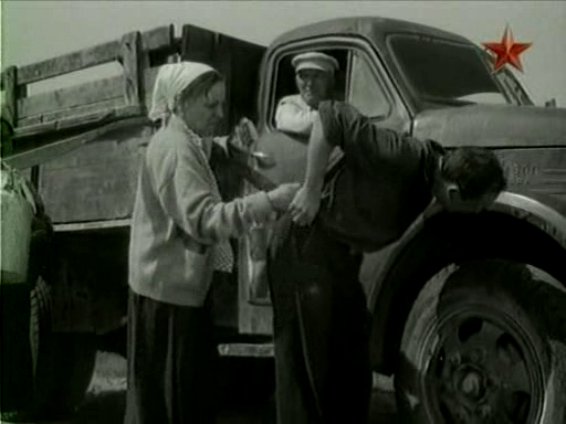 Обычный для того времени ГАЗ-51А с необычными и довольно редкими для этой машины покрышками с протектором "Ёлочка". Забавный кадр, как шофёр, осматривая колесо, протягивают руку за платой за проезд: