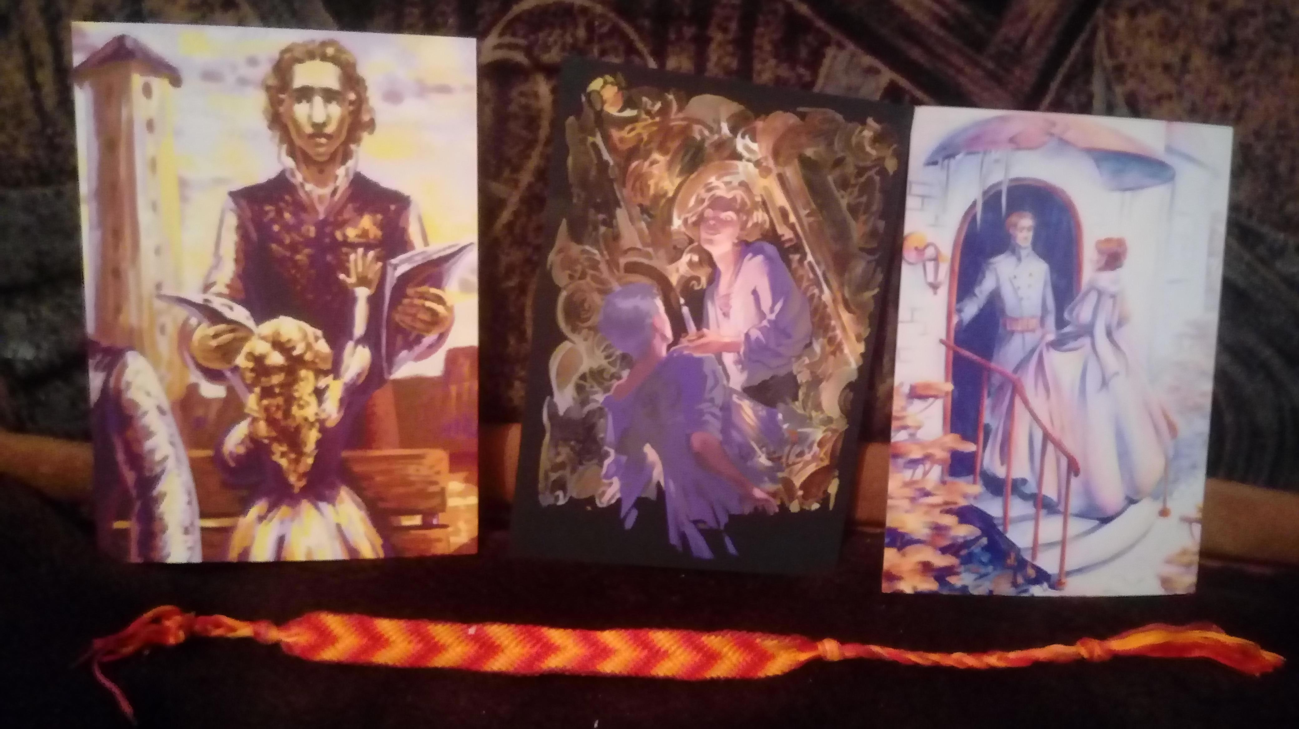 А вместе с книжкой пришёл и мерч в виде трёх открыток и закладки для книги.