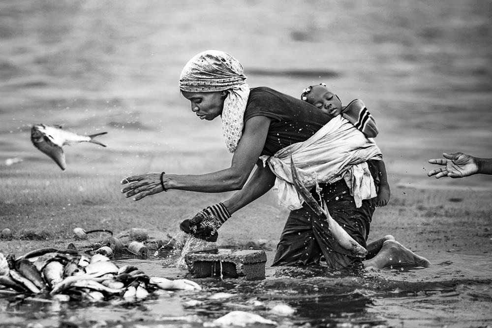 Редакционная фотография, победитель документального фильма "Жизнерадостные матери" Жоао Коэльо. Цель этого сериала - показать силу и жизнестойкость ангольских женщин. Они обременены ответственностью, обязательствами и повинностями, которые несправедливо не разделяют их мужья или партнеры, в частности тяжелой работой, с которой им приходится сталкиваться, чтобы прокормить своих детей. Несмотря на эти обстоятельства, им удается образцово исполнять роль матерей, держа своих детей рядом с собой во время работы, кормя их грудью в самых неблагоприятных условиях и демонстрируя открытые и искренние улыбки даже под тяжестью усталости.