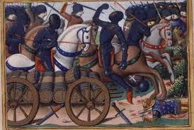 У командира шотландского контингента сэра Джона Стюарта не выдерживают нервы, и, ослушавшись приказов графа де Клермона, он спешивает всех своих людей и бросает в атаку на один из входов английского вагенбурга. На шотландцах были лёгкие доспехи, вследствие чего английские лучники и арбалетчики нанесли им тяжелейшие потери, причём сами остались практически невредимыми. Более того, французам пришлось прекратить огонь, чтобы не задеть своих.