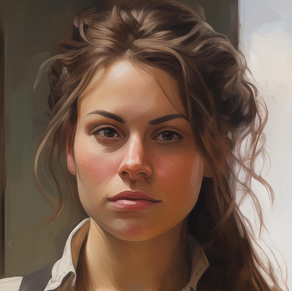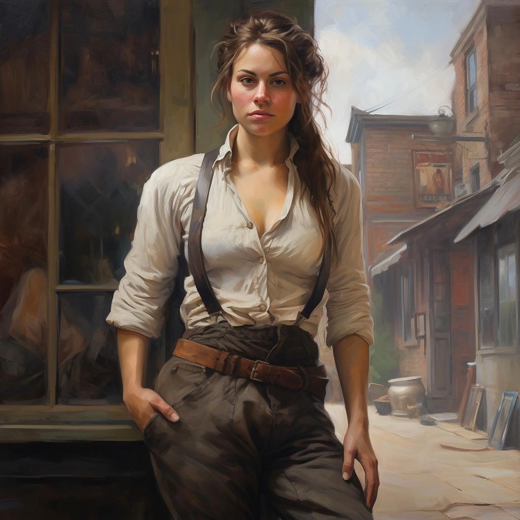 Те, кому нужна была девушка-некрасавица, обратите внимание. Это промпт "mighty strong 25 years old lady in victorian shirt, simple vest and pants, victorian town, expressionism painting --no makeup". После выбора одной картинки я ей сделала Vary (Subtle). Из четырех вариантов два были вполне "некрасавицы", только одна почему-то с голым животом. Но после Subtle практически всегда лицо можно переставить на другой вариант. Очень советую, если работаете с нейронками, освоить фотошоп хотя бы на уровне "замазать, переставить, убрать прыщик, подправить нос".