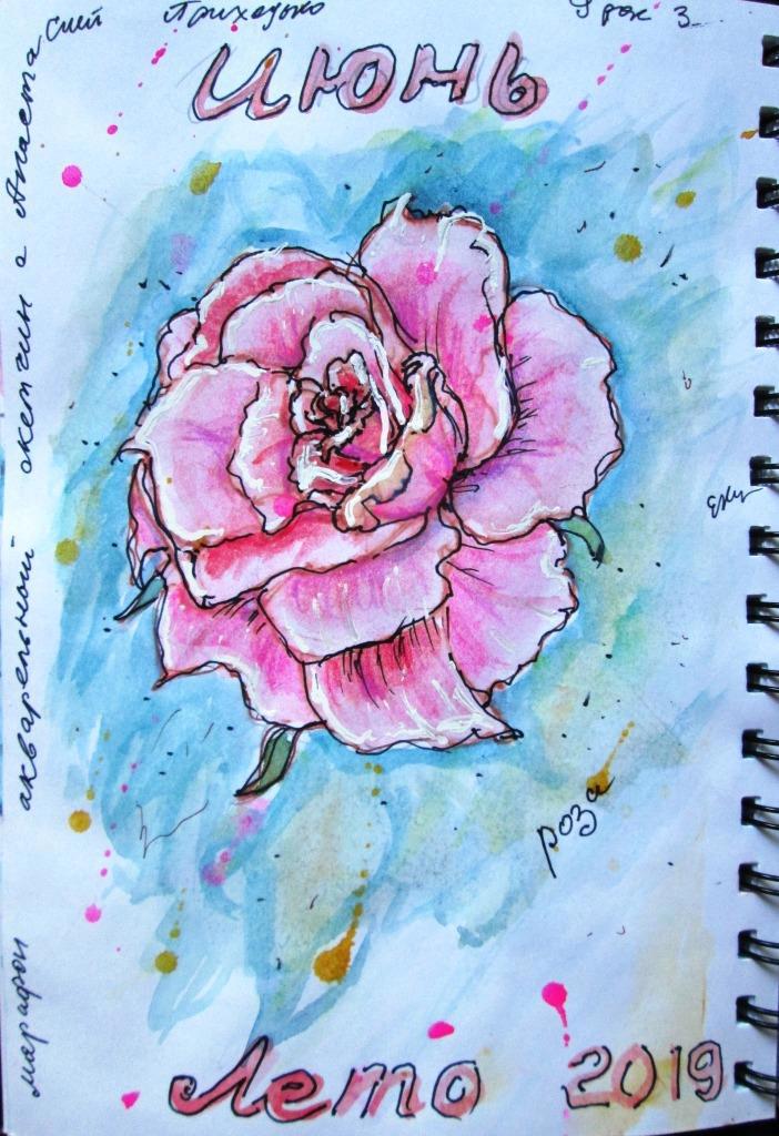Роза мне не вполне удалась, но я довольна, так как розы акварелью раньше вообще не рисовала. Мне они казались слишком сложными. У меня она получилась скорее декоративная, чем реалистичная. Использовались, как и в предыдущем уроке, линер, акварель и белый корректор.
