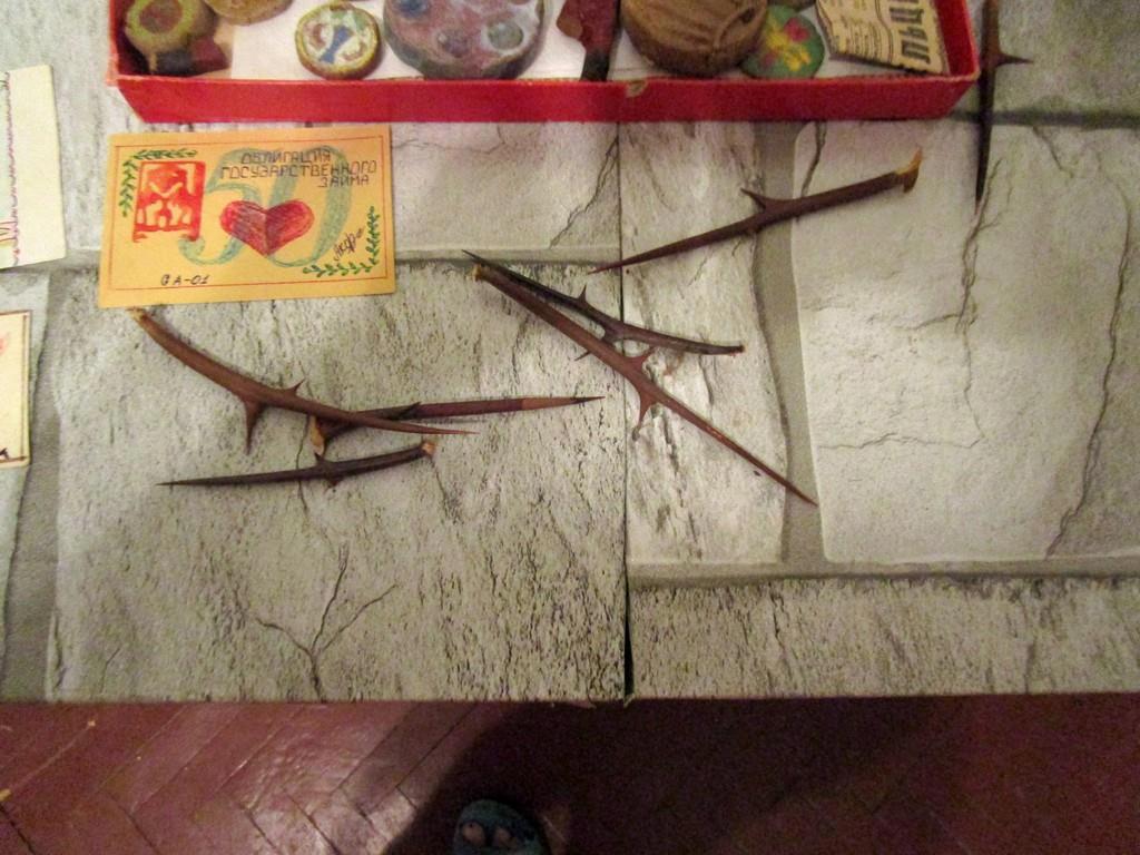 У каждого из нас была своя валюта, мы делали деньги из глины - сперва делали печать, обжигая ее в лабораторной печи, а потом штамповали монеты и раскрашивали акварелью. У Витьки были динары, у Мишки фертинги, у меня франки, у Павлика червонцы и так далее. Бумажные деньги тоже были в ходу, но с ними бло сложнее, на них требовалась подпись казначея. На деньги мы играли в карты, выпускали лотерейные билеты, покупали то, что у нас ценилось. Внизу справа - ужасные колючки гигантской акации.