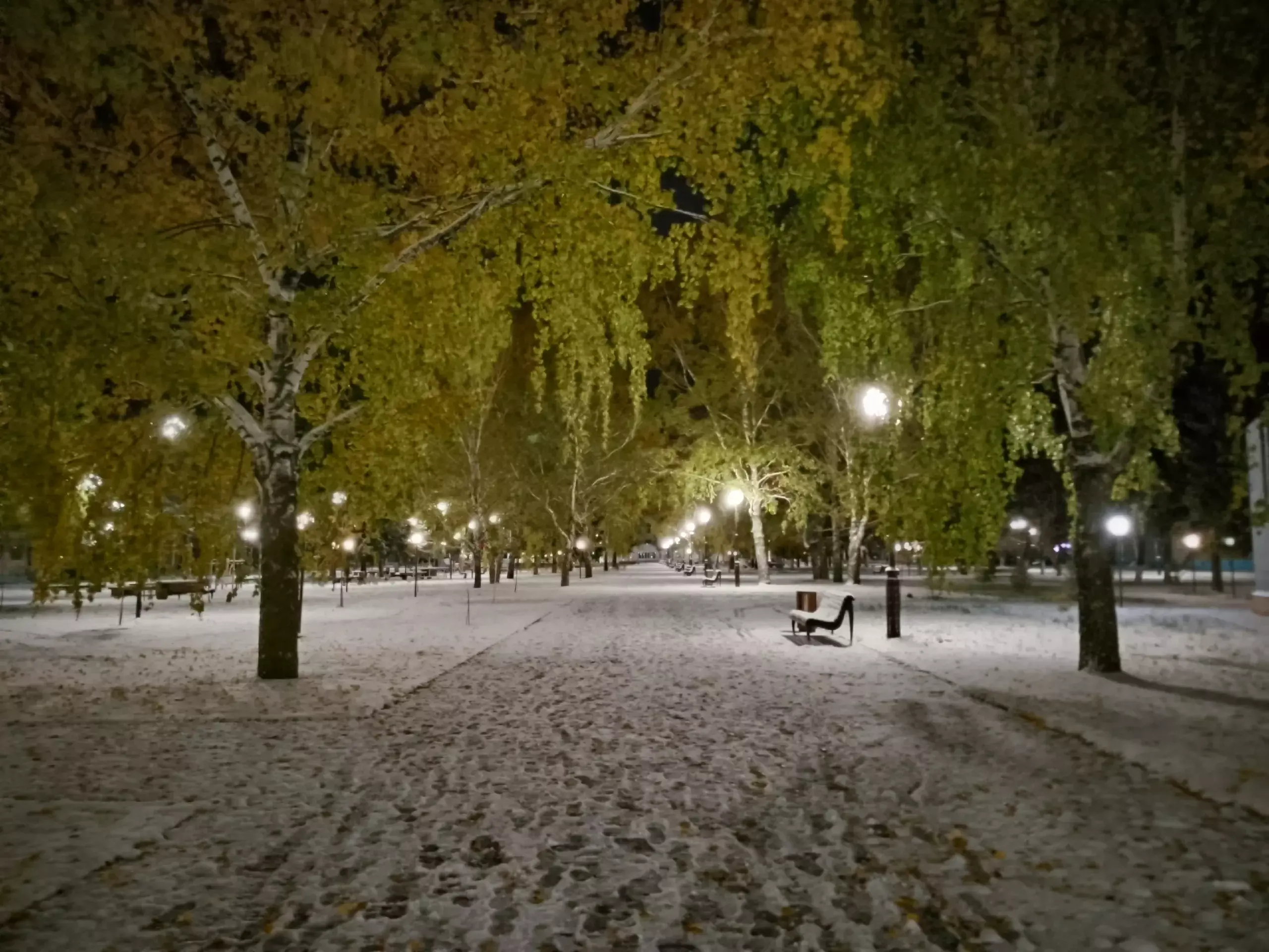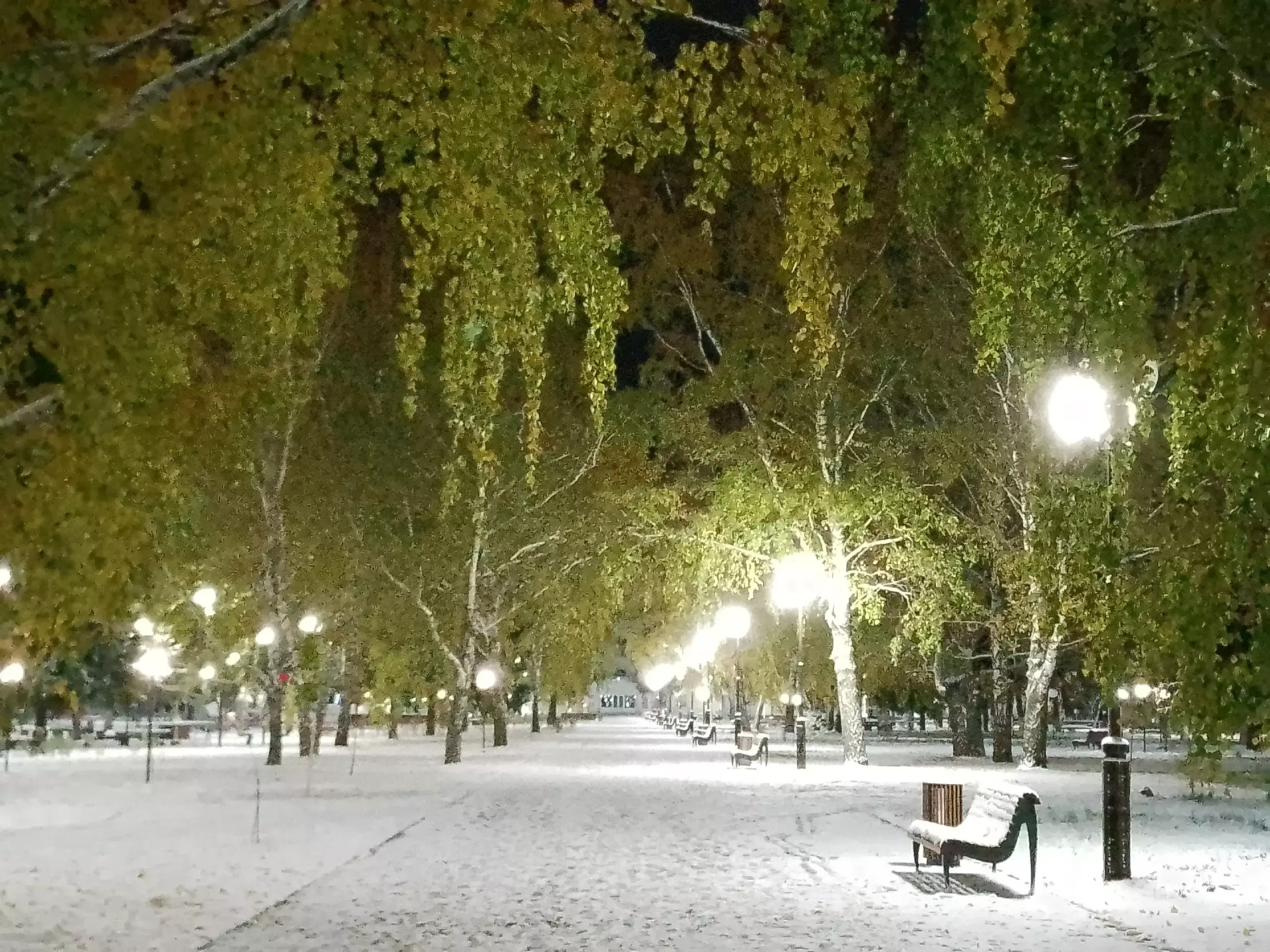 А потом дошло. В этом году была очень тёплая осень. Обычно первые заморозки приходятся уже на начало сентября. Но, поскольку, первый мороз как-то незаметно побывал в наших краях только в середине октября, зацепив лишь верхушки самых нежных растений, до этого снегопада многие деревья ещё не успели полностью пожелтеть. Уж молчу о цветочках! У меня, например, ещё во всю цветут под окнами октябрины и поздние хризантемы, и разные однолетники. А увидев вечерний парк, я не смогла сдержать возгласа "вау!" -- реакция, как и у большинства местных жителей)))