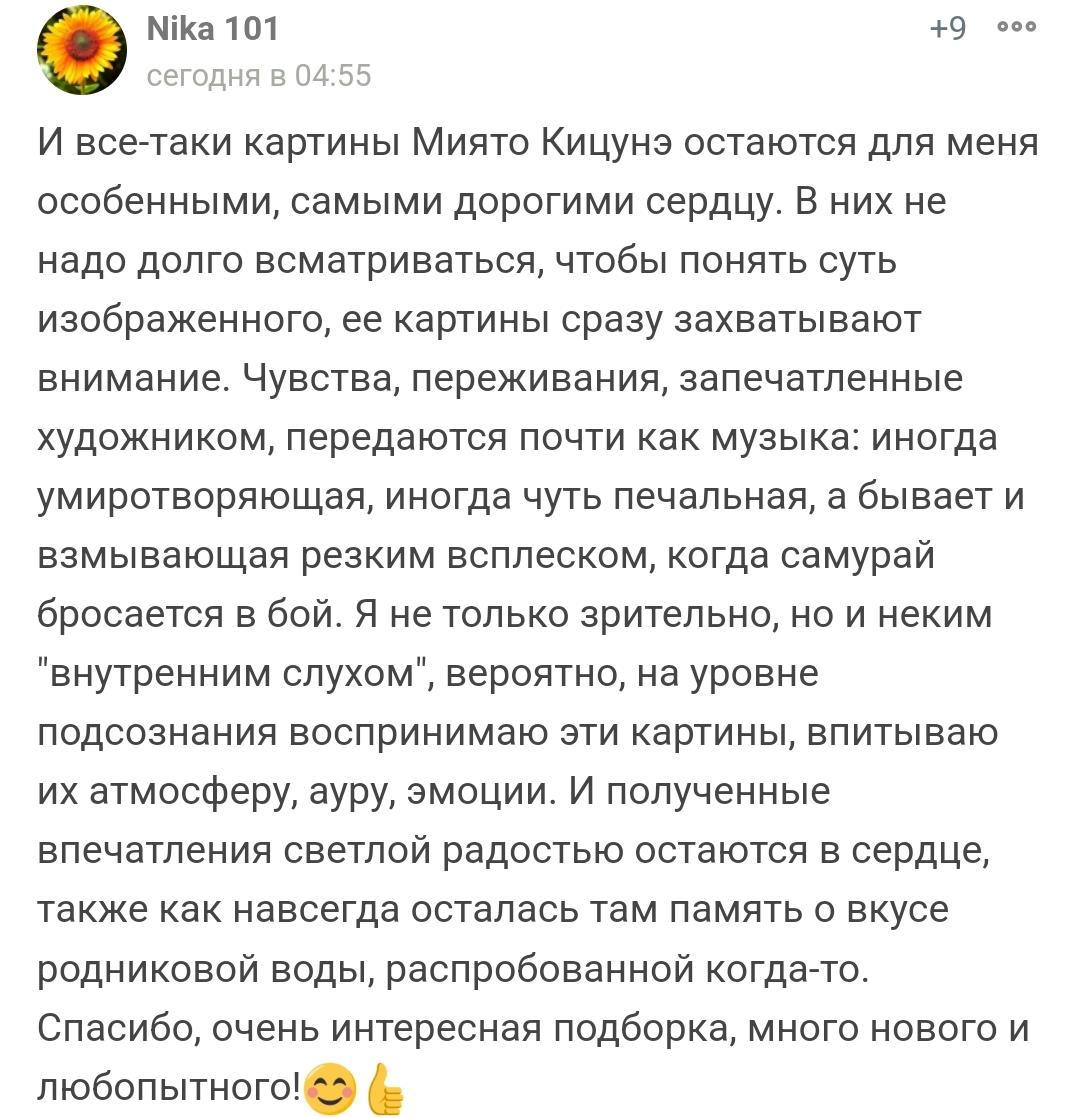 Автор: XpathИ все-таки картины Миято Кицунэ остаются для меня особенными, самыми дорогими сердцу. В них не надо долго всматриваться, чтобы понять суть изображенного, ее картины сразу захватывают внимание. Чувства, переживания, запечатленные художником, передаются почти как музыка: иногда умиротворяющая, иногда чуть печальная, а бывает и взмывающая резким всплеском, когда самурай бросается в бой. Я не только зрительно, но и неким "внутренним слухом", вероятно, на уровне подсознания воспринимаю эти картины, впитываю их атмосферу, ауру, эмоции. И полученные впечатления светлой радостью остаются в сердце, также как навсегда осталась там память о вкусе родниковой воды, распробованной когда-то.