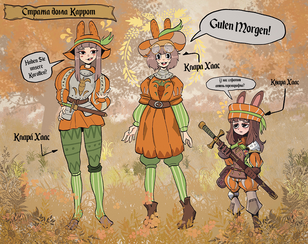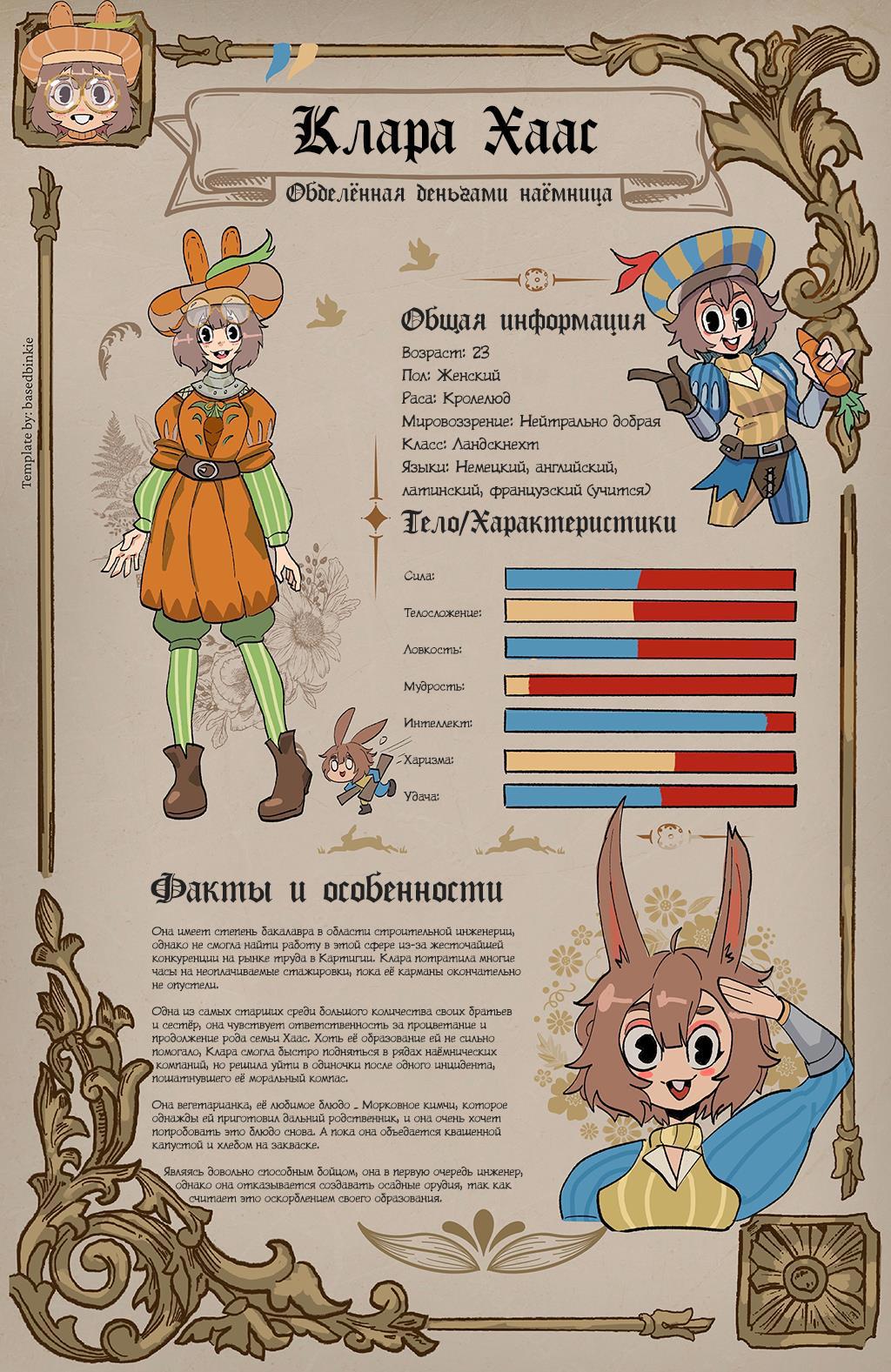 Автор: Руслан БирюшевПеревод комиксов BasedBinkie добрался до листов персонажей, и я не могу не вытащить сюда парочку - а также ещё несколько ждущих перевода. Страничка моей безусловно любимой героини этого сеттинга - Клары, кролика-ландскнехта. Да, она, оказывается, носит очки, когда не на войне, что объясняет её тактику махать вокруг себя двуручником как пропеллером.