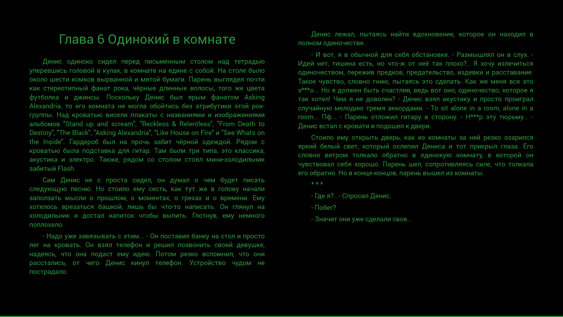 Автор: МаркЭта глава является экспериментальной с частичкой продолжения сюжета. Название и сама глава являются отсылкой на сами знаете какую рок-группу. Книга называется: Побег из симуляции. Автор я.