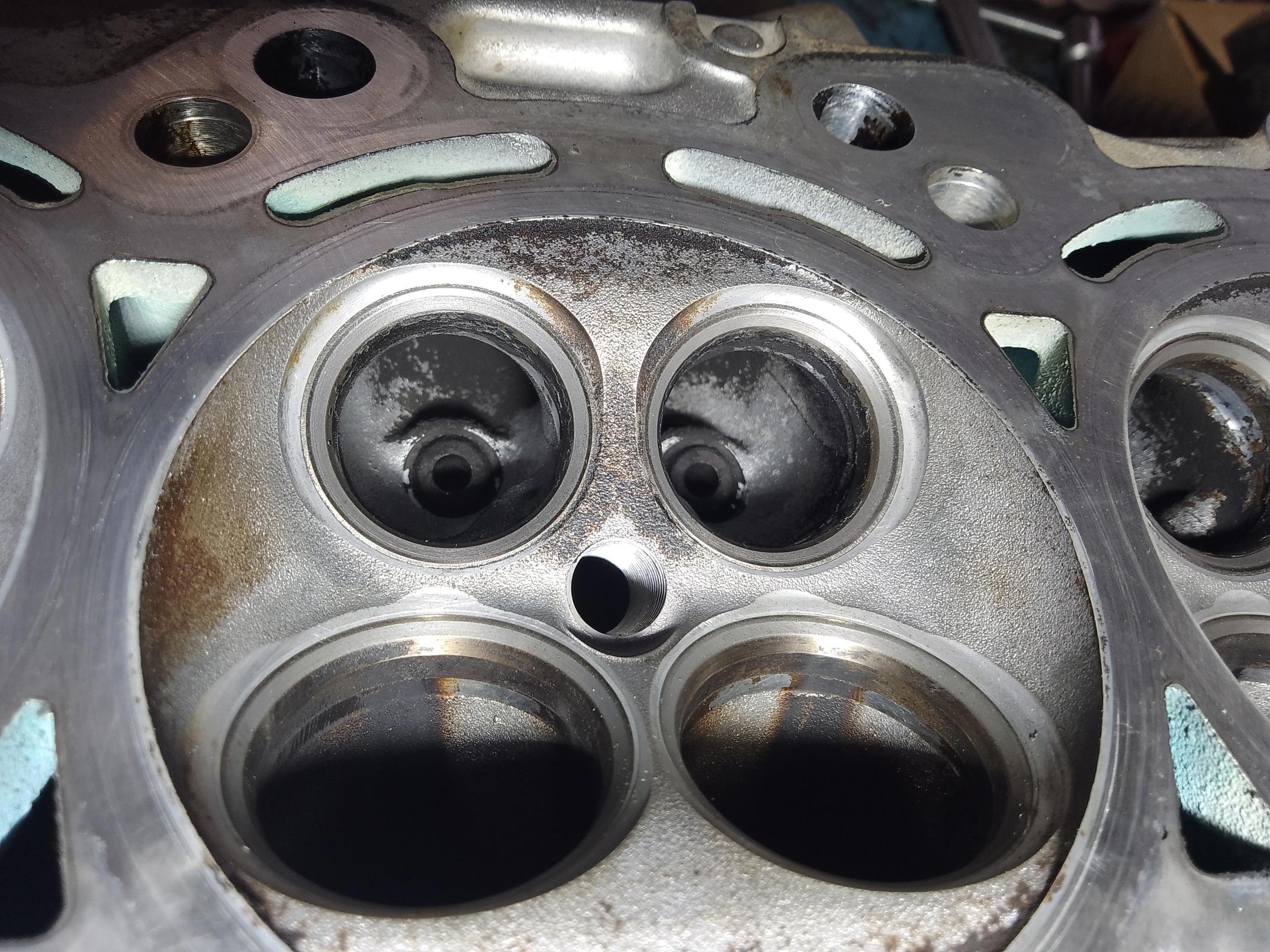 Тут впукные клапана уже притёрты, впуск ещё нет. На сёдлах видно черный кариес раковин, вот их-то в основном и убираем притиркой. Можно прирезать сёдла, но тут есть "но", можно не угадать с углом, и получится фигня. Поэтому трём.