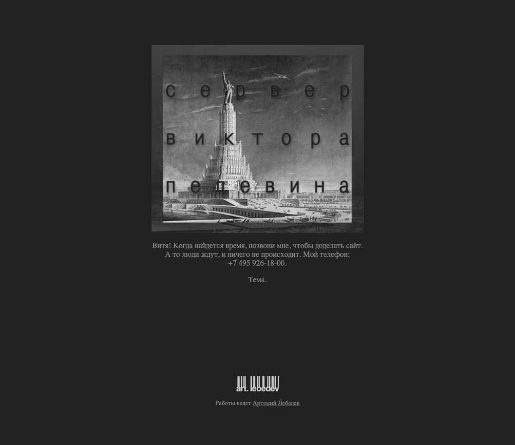 При этом самого Пелевина уже лет двадцать как не могут найти. Он пропал с концами, канул в неизвестность. У него нет ни сайта, ни инсты, ни канала в телеге, ни Ютуб-канала… Он не ходит на интервью, не участвует в дебатах. Ну, в общем, вы поняли. Затворник. Одиночка. Отшельник. И он всё равно самый популярный (объективно) российский писатель. На сайте, который начинал ему делать другой гениальный маркетолог Артемий Лебедев (дизайнером его язык не повернётся назвать), до сих пор висит визитка от Тёмы, которую я прикреплю пикчей к данному посту.