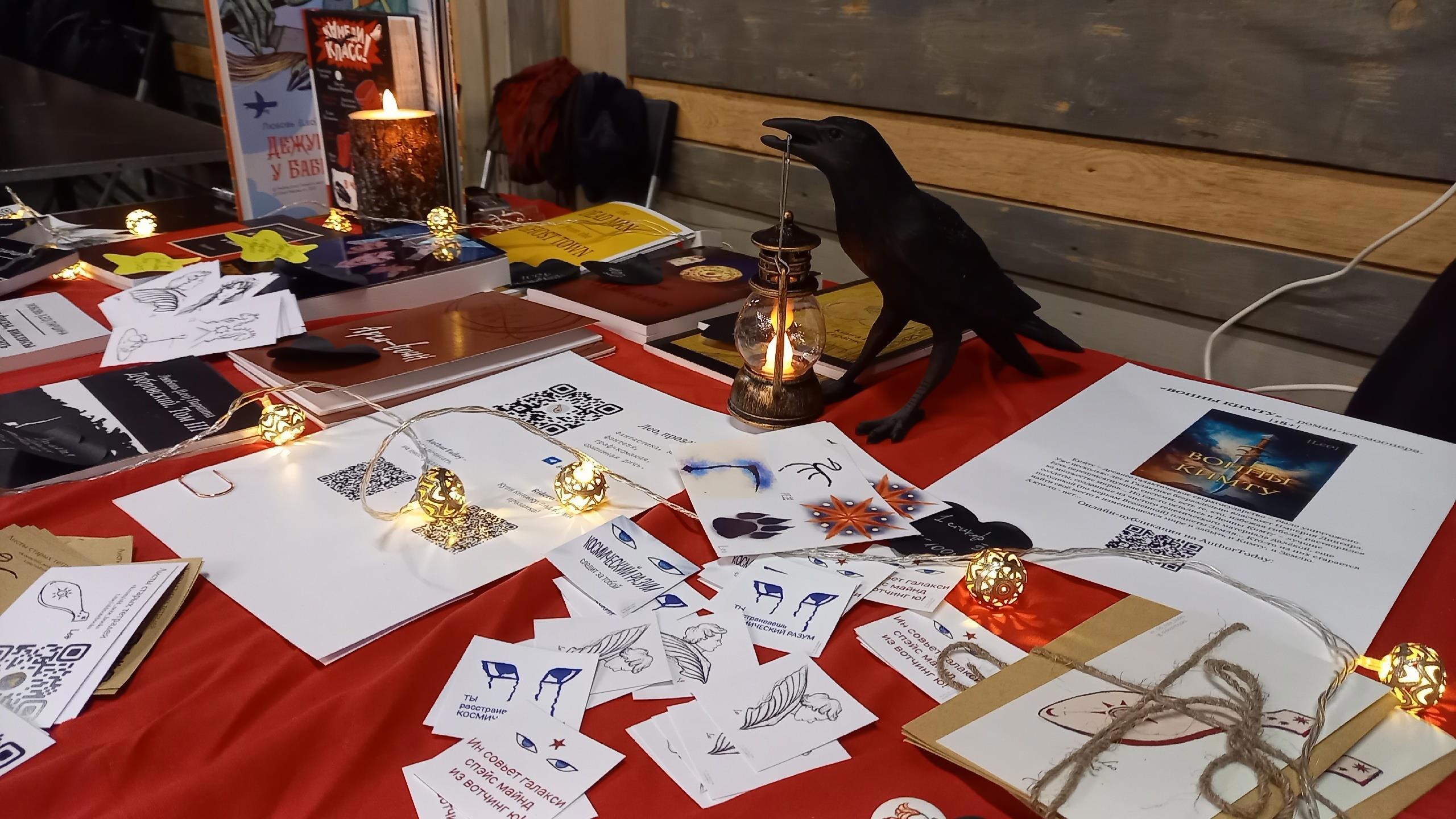 Заявлялась как прозаик и автор статей, но к самому фестивалю допечатала еще мерча - наклеек, открыток, значков. Что-то на тему моих произведений, что-то просто мистическое, включая питерскую городскую легенду.