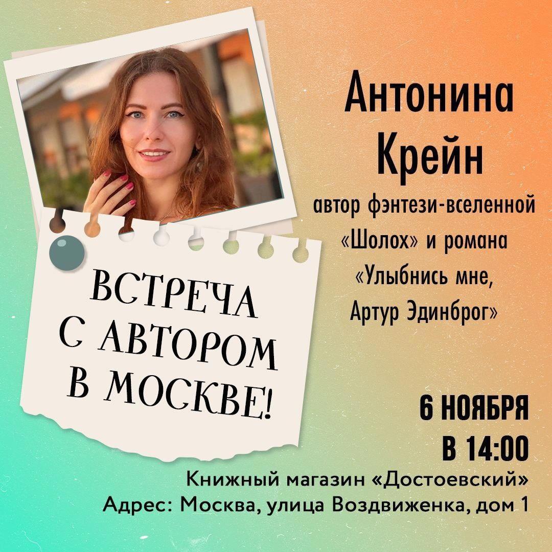 Автор: Антонина КрейнУютная книжная встреча в центре Москвы! Приглашаю вас — читателей и писателей — в понедельник 6 ноября (выходной день) в 14:00 в книжный магазин "Достоевский" на Воздвиженке, город Москва.