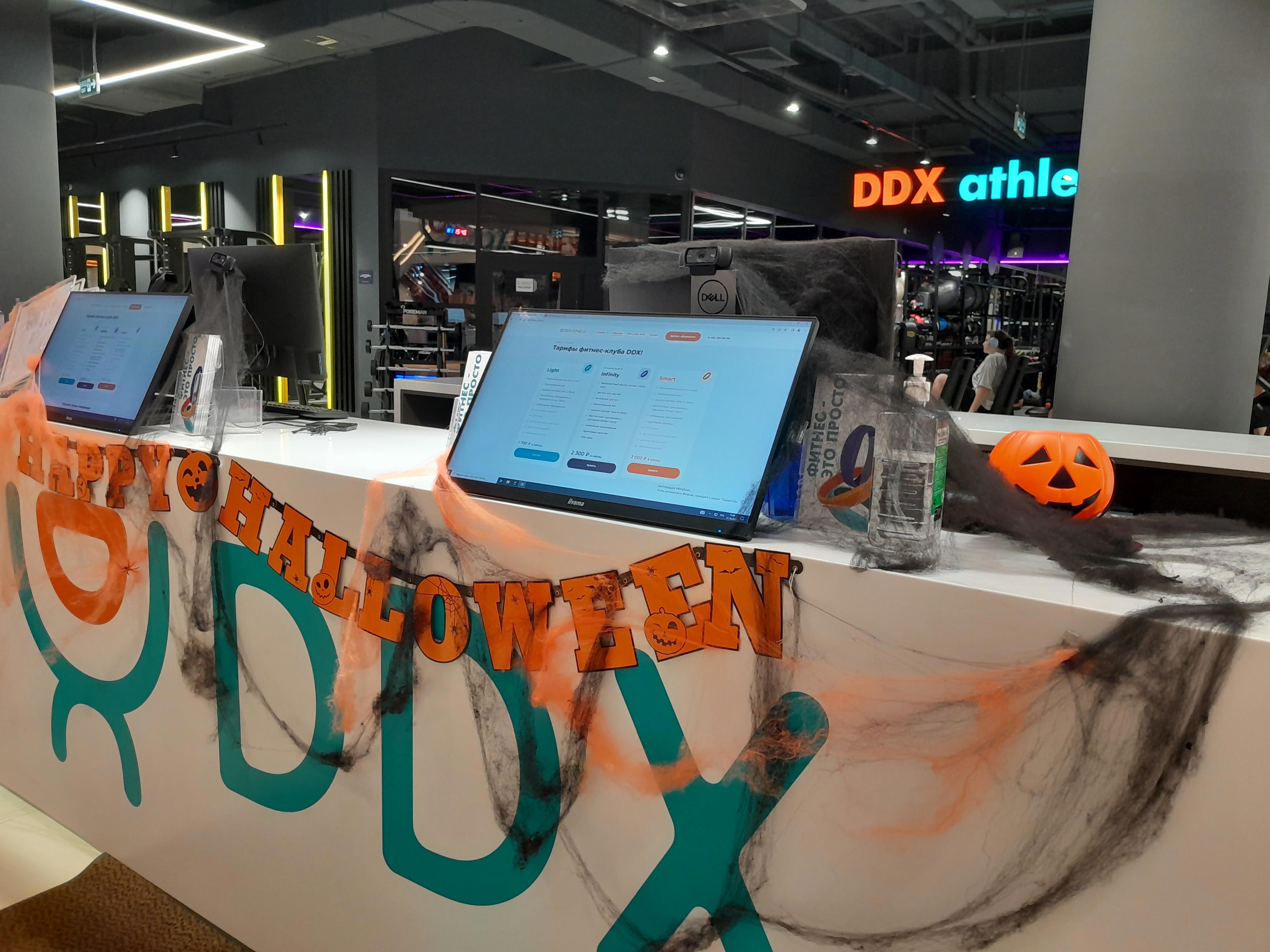 А так сегодня встречали в фитнес-клубе. За стойкой были ещё два тренера в костюмах ангеда и чёртика, но к сожалению. пока я закончила тренировку они куда-то ушли, пришлось фотографировать без них.