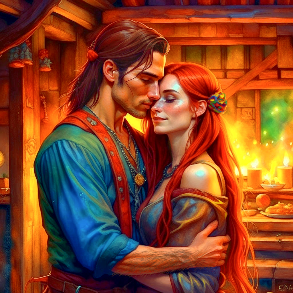 А на третьем изображены второстепенные, но очень дорогие для меня и колоритные герои Хейкки и Сату. Они оба принадлежат к потустороннему миру - это домашние духи, сохраняющие теплую и мирную ауру, благоволящие к людям, и тем не менее сердить их не стоит. Традиционно домовых изображают совсем иначе, и мне стало интересно представить их молодыми, сильными и страстно влюбленными.