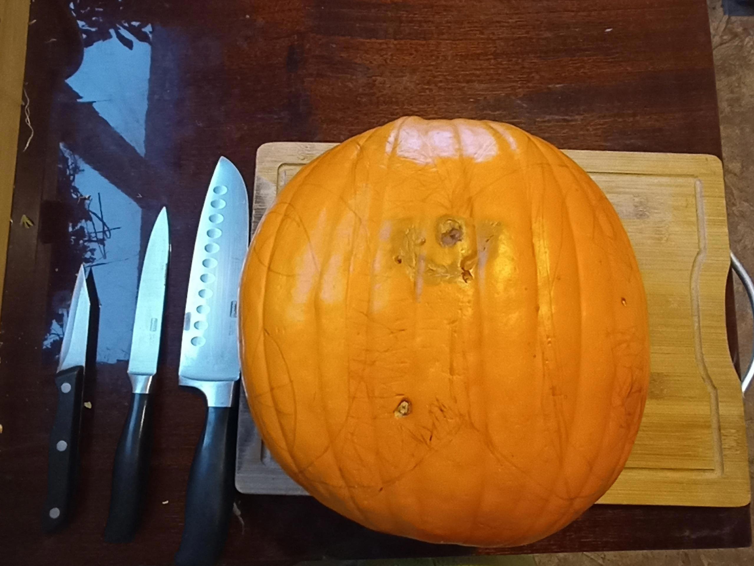 Это заняло время. Несколько раз пришлось всё перерисовывать, так как получалось не очень симметрично, да и прогнившие места мешали. Но, в конце концов, я смогла накинуть примерные мордочки будущему Джеку и приступила к вырезанию фонарика.