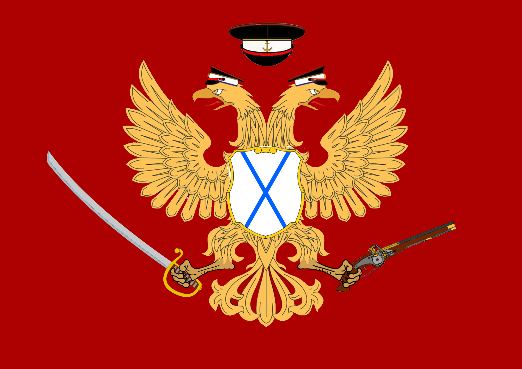 Вместо скипетра он держит в правой лапе палаш, как символ силы удара Джека на ближнем расстоянии. Скипетром, в принципе, тоже можно по лбу треснуть ближнему своему. А вместо державы он держит колесцовый дульнозарядный пистоль, потому что Джек может подстрелить и тех, кто от него "на другом конце Державы". Короны заменены на фуражки, потому что Джек не Царь, не Король и, уж тем более, не Император, а буквально военный диктатор, создавший свою, пока что, квази-государственную структуру, основу которой составляет военная хунта. Якорь вместо кокарды на главенствующей фуражке обозначает флотскую принадлежность этой структуры, как и Андреевский Флаг на гербовом щите на груди Орла.