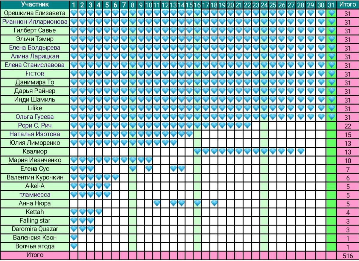 Сводная таблица участников и пройденных дней челленджа