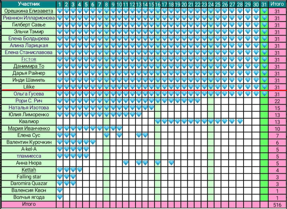 За месяц написаны творения на 31 тему, всего их получилось 32 (на одну тему две зарисовки нарисовались), ну или же 95 806 ЗСП либо 2,40 а.л. Кто-то скажет, что мало, но в условиях, что был неписец считаю себя молодцом. Бриллиантики были заслуженными, осталось почитать товарищей, что как и я тратили в этом месяцы силы на письмо.