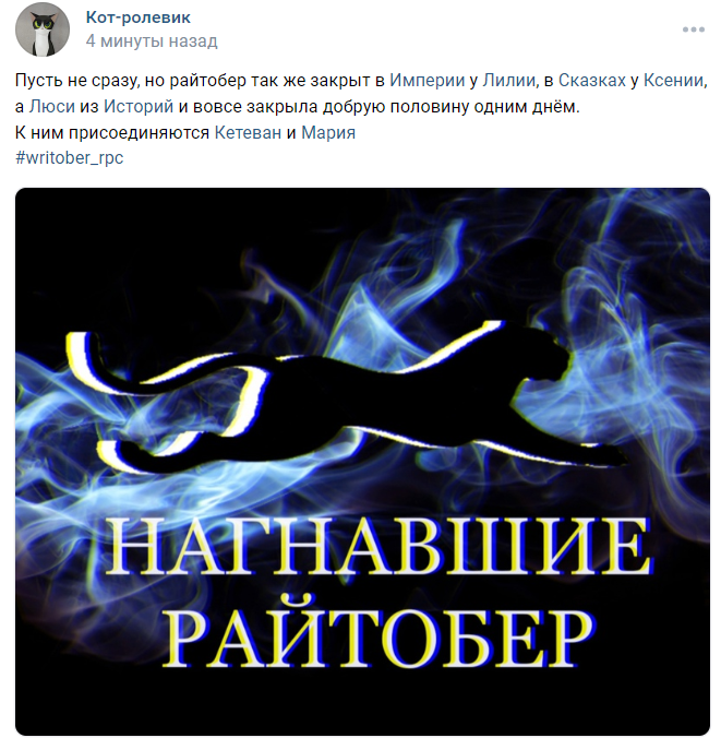 Writober в следующем году планирую продолжить поддерживать. А вот над участием в конкурсах надо подумать. Хотя бы потому, что участие ради участия перестает привлекать. Тем более, когда жанры не очень близки.
